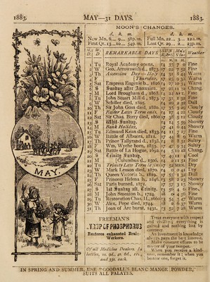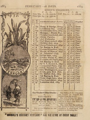 Credit: Goodall's household almanac for 1883 : containing valuable information, reliable weather tables, and an excellent guide to domestic cookery a key to household treasures help you can always rely upon / Goodall, Backhouse & Co. Source: Wellcome Collection.