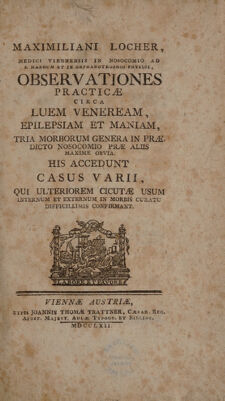 Observationes practicæ circa luem veneream, epilepsiam et maniam, tria morborum genera in prædicto nosocomio præ aliis maxime obvia. His accedunt casus varii, qui ulteriorem cicutæ usum internum et externum in morbis curatu difficillimis confirmant / Maximiliani Locher.