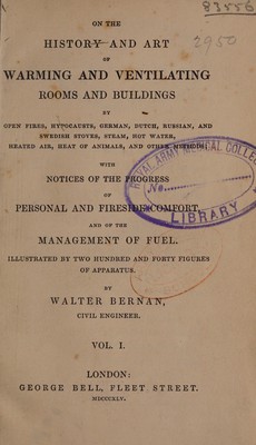 On the history and art of warming and ventilating rooms and buildings, by open fires, hypocausts, German, Dutch, Russian, and Swedish stoves, steam, hot water, heated air, heat of animals, and other methods; with notices of the progress of personal and fireside comfort, and of the management of fuel. Illustrated by two hundred and forty figures of apparatus / By Walter Bernan [pseud.].