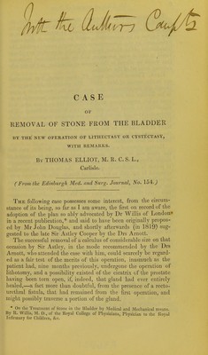 Credit: Case of removal of stone from the bladder by the new operation of lithectasy or cystectasy, with remarks / by Thomas Elliot. Source: Wellcome Collection.