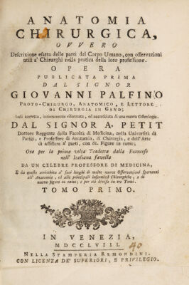 Anatomia chirurgica ... Opera ... riformata, ed accresciuta di una nuova osteologia / Dal signor A. Petit ... ora per la prima volta tradotta ... nell'italiana favella da un celebre professore di medicina [Giovanni Larber], e da questo arricchita ... di molte nuove osservazioni.