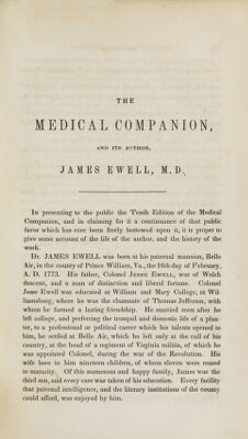 The medical companion, or, Family physician : treating of the diseases of the United States, with their symptoms, causes, cure, and means of prevention : common cases in surgery, as fractures, dislocations, &c. : the management and diseases of women and children : a dispensatory, for preparing family medicines, and a glossary explaining technical terms : to which are added a brief anatomy and physiology of the human body showing, on rational principles, the cause and cure of diseases : an essay on hygieine [sic], or the art of preserving health without the aid of medicine : an American materia medica, pointing out the virtues and doses of our medicinal plants : also, the nurse's guide / by James Ewell.