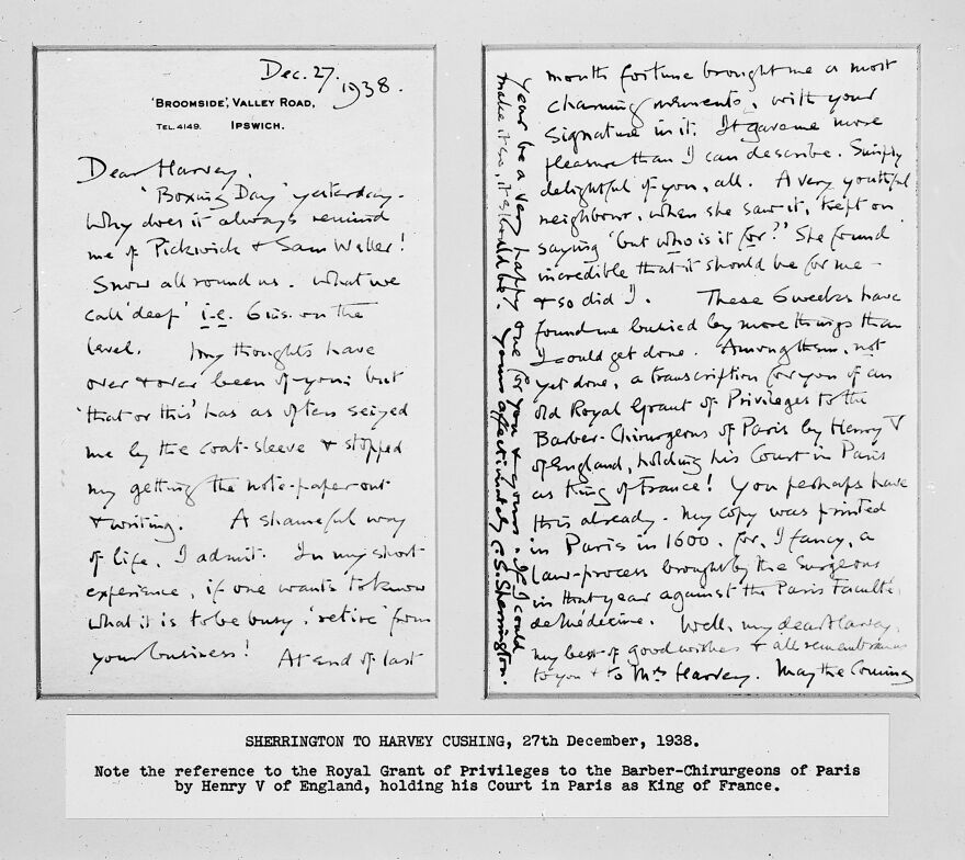 M0016235: Display board: letter from Sherrington to Harvey Cushing, 27 December 1938