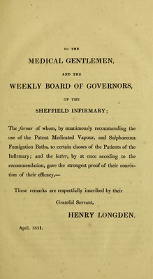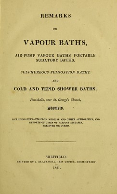 Remarks on vapour baths, air-pump vapour baths, portable sudatory baths, sulphureous fumigation baths, and cold and tepid shower baths; Portobello, near St. George's Church, Sheffield : including extracts from medical and other authorities, and reports of cases of various diseases, relieved or cured.