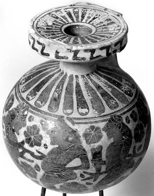 Credit: M0018096: Round aryballos, late Corinthian, showing 6 padded dancers and a siren. Source: Wellcome Collection.