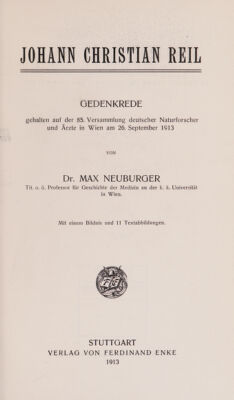 Johann Christian Reil : Gedenkrede gehalten auf der 85. Versammlung deutscher Naturforscher und Ärzte in Wien am 26 September 1913 / von Max Neuburger.