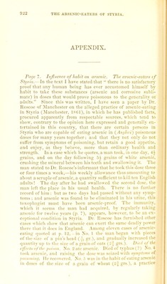 ![APPENDIX. Piige 7. Influence of habit on arsenic. The arsenic-eaters < f Btyrin.—In the text I have stated that there is no satisfactory proof that any human being has ever accustomed himself by hahit to take these substances (arsenic and corrosive subli- jnate) in doses that would prove poisonous to the generality oi adults. Since this was written, I have seen a paper by Dr. Roscoe of INIanchester on the alleged practice of arsenic-eating in Styria (^lanchester, It^Gl), in which he has published fact.*, procured apparently from respectable sources, which tend to .show, contrary to the opinion here expressed and gcneralh' en- tertained in this country, that there are certain persons in Styria who are capable of eating arsenic in (AnvUri) poisonous doses for many years together; and tiuit they not only do not suffer from symptoms of poisoning, but retain a good appetite, and enjoy, as they believe, more than ordinary health and strength. In a ca.se wliich he (piotes, a man took, in one day. Ah grains, and on the day following .'i.^ grains of white arsenic. Cnishing the mineral between his teeth and swallowing it. The man stated to Dr. Hoscoe's informant that lie took this dose thrive or four times a week,—his weekly allowance thus amounting to about a scruple of arsenic, a (piantity sufficient to kill ten Knglish adults! The day after he had swallowed the second dose, tb.e man left the place in his usual health. There is no further record of him : but as two days had (lassed without any symp- toms : and arsenic was found to be eliminated in his urine, this toxo|)lK'.!;ist must have been arsenic-proof. The iuimuniiy. which it seems the man liad accpiired. by regularly taking arsenic for twelve years (p. 7), ajipears. Iiowever. to be an ex- ce])li(mal eonditicm in Styria. Dr. Uoscoe has furnished other cases which show llial arsenic can exert the same deadly power there that it does in Kngland. Among eleven cases of arsenic- eating quoted at p. I'J. - in No. 1 the man began with pieces of the size of a iiin's Iiead (J-i gr.). and gradually increased the (piantity up to the size of a grain of oats ( J',' grs.). DieJ of the rfl'i'cts n/'tlie piiisnn. No. 2 ate arsenic. Died of typhus (?) No. 4 took arsenic, and raising tiie dose was seized with symptows of ji<)isimin<f. lie recovered. No. .'> was in the habit of eating arsenic in doses of the size of a grain of wlieat (2^ grs.), a practice](https://iiif.wellcomecollection.org/image/b21935221_0936.jp2/full/800%2C/0/default.jpg)