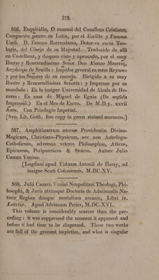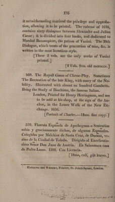 ![it notwithstanding received the privilege and approba¬ tion, allowing it to be printed. The volume of 1616, contains sixty dialogues between Alexander and Julius Cassar ; it is divided into four books, and dedicated to Marshal Rassompiere, the patron of Vanini. The 39th Dialogue, which treats of the generation of man, &c. is written in the most licentious style. [These 2 vols. are the only works of Vanini printed.] [2 Vols. 8vo. old morocco.] ——.r 569. The lloyali Game of Cliesse-Play. Sometimes The Recreation of the late King, with many of the No¬ bility. Illustrated with almost an hundred Gambetts. Being the Study of Biochimo, the famous Italian. London, Printed for Henry Herringman, and are to be sold at his shop, at the sign of the An¬ chor, in the Lower Walk of the New Ex¬ change. 1656. [Portrait of Charles.—12mo. fine copy.] 570. Horesta Espanola de Apothegmas o Sententias sabia y graciosamente diclias, de algunos Espanoles. Colegidas por Melchior de Santa Cruz, de Duenas, ve- zino de la Ciudad de Toledo. Dirigidoal Excellentis- simo Senor Don Juan de Austria. En Salamanca casa de Pedro Lasso. 1592. Con Licencia. [18mo, calf, gilt leaves.] Harping and Wright, Printers, St. John’s-Square, London. : a A , A u i**--'-1 At* ^](https://iiif.wellcomecollection.org/image/b31875191_0202.jp2/full/800%2C/0/default.jpg)