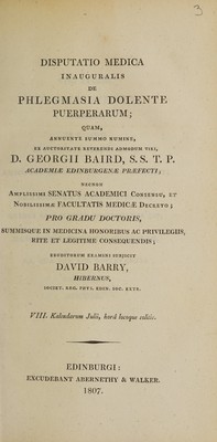 Disputatio medica inauguralis de phlegmasia dolente puerperarum ... / Eruditorum examini subjicit David Barry.