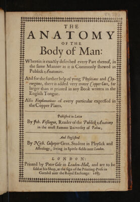The anatomy of the body of man: wherein is exactly described every part thereof / ... Published in Latin by Joh. Veslingus ... And Englishd by Nich. Culpeper.