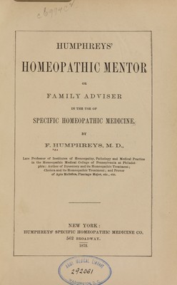 Humphreys' Homeopathic mentor or Family adviser : in the use of specific homeopathic medicine / by F. Humphreys.