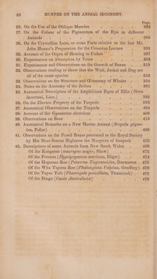 ![CONTENTS. , Page Preface of the Editor : ; ad 1. Description of the Situation of the Testis in the Festus with its , descent into the Scrotum : 4] 2. Observations on the Glands slitiated between the Hectuie and Bladder, called Vesiculee Seminales : : : : 58 3. Account of the Free-martin . , ; ais 70 4, Account of an extraordinary Biieteant : : : . 79 5. Experiments to determine the effect of extirpating one ovarium upon the number of Young produced ; : : « 85 6. Case of a young Woman who poisoned herself in the first month of Pregnancy, with a description of the Uterus. : 89 7. On the Structure of the Placenta. 5 : F 93 8. Observations on the Placenta of the Neues ; : 103 9. Account of a Woman who had the Small-pox during Pregnancy, and who seemed to have communicated the same Disease to the Fetus ; : j : : ; 105 10. Some ee on Wigesion iz : : : : 112 11. On the Digestion of the Stomach after Death ‘ 144 12. On a Secretion in the Crop of breeding Pigeons, for the vioifiiale ment of their Young ~ 149 13. Observations on the Gillaroo PFOLL abmdionly conte in Trelend the Gizzard Trout ‘ : : 151 14. Experiments and Observations on ere sith seahert to the power of producing Heat. : ‘ 155 15. Experiments and Observations on Veccishice with oo tE to the power of producing Heat : : : 177 16. Proposals for the Recovery of Persons apiaceualy drowned 185 17. Account of certain Receptacles of Airin Birds, which communi- cate with the Lungs and Eustachian Tube. : 194 18. Description of the Nerves which supply the Organ of Salting 204 19. Description of some Branches of the Fifth Pair of Nerves 209 20. Croonian Lecture on Muscular Motion, No. I. : : 211 Me. Doc... De, Do. No. IL. aos 238 22. Do; Do. Do. Do. No. III. : ; 254 23. De. Do. Do. Do. No. IV. : : 262 24. Do. Do. Do. Do. No. V. i, : 265](https://iiif.wellcomecollection.org/image/b33292292_0047.jp2/full/800%2C/0/default.jpg)