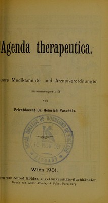 Agenda therapeutica : neuere Medikamente und Arzneiverordnungen / zusammengestellt von Heinrich Paschkis.
