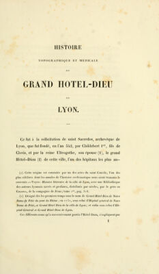 Histoire topographique et médicale du Grand Hôtel-Dieu de Lyon : dans laquelle sont traitées la plupart des questions qui se rattachent à l'organisation des hôpitaux en général / par J.-P. Pointe.