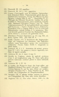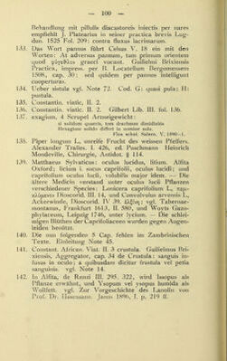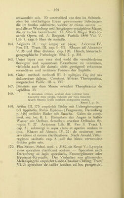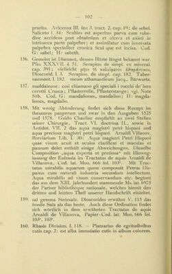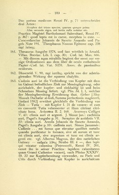 ![umwandeln sah. Er unterschied von den im Schmelz- ofen bei zinkhaltigen Erzen gewonnenen Substanzen die im fundus sublimirte, welche er climia nannte, — und die an Wandung und Ausgängen präcipitirte Masse, die er tuchia bezeichnete. B. Alberti Magni Ratisbo- nensis Opera ed. A. Borgnet. Parisiis 1890 Vol. V. Lib. 4. cap. 6 liber de metallis. 164. Aegineta IV: nepl Xeiupac %cd ^wpac;. Avicenna IV. Fen. III. Tract. III. cap. I—III. Rhases ad Almansor V. 35 und liber division. cap. 120. Hirsch, historisch- geographische Pathologie 1864. I. p. 301. 165. Unter lepra non vera sind wohl die verschiedenen fleckigen und squamösen Exantheme zu verstehen, vielleicht auch die damals nicht genügend erkannten secundären und tertiären Formen der Syphilis. 166. Galen, method. medendi III. 2: 7Cp6§yjXov S'cbg «reo xcov aTuXouaxdTWV ap^yjxau Constant. African. Therapeutica, megatechni Partie. III. u. VII. 167- Bimstein aus dem Meere erwähnt Theophrastus de lapidibus 33. 168. Si maculam retines, oculum dum volvitur intra Conspice dum pergis, rubeum per rura limacem Quem findens oculo medium componito rectus. Renzi I. p. 76. 169. Aetius III. 175 empfiehlt Bäder mit Uebergiessungen bei lippitudo, Rufus Ephesus [Fragmente, Daremberg p. 346] ordinirt Bäder mit Douche. Galen de comp, med. sec. loc. II. 1. Eintunken der Augen in kaltes Wasser mit Oeffnen derselben erwähnt Oribasius Sy- nopsis V. 27- Avicenna Lib. III. Fen 3. Tract. 1. cap. 5: submergi in aqua clara et aperire oculum in ipsa. Rhases ad Almaus. IV. 22: de oculorum con- servatione et eorum clarificatione. Nach Arnald. Villau, regimen sanitatis cap. 8 soll das hiezu verwendete Gefäss grün sein. 170. Flos Salern. Schol. med. v. 3182, de Renzi V.: Lympha viror speculum clarificant oculum. — Speculum nach Daremberg == lapis specularis, Fensterglimmer oder Gypsspat-Krystalle. Das Vorhalten von glänzenden Metallspiegeln empfiehlt Guido Chauliac Chirurg. Tract VI. 2: speculum de calibe laudant ad hoc perspectivi.](https://iiif.wellcomecollection.org/image/b21635961_0152.jp2/full/800%2C/0/default.jpg)