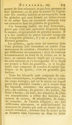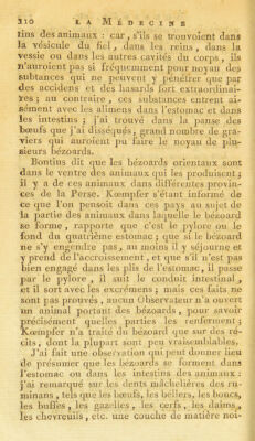 ![tins des animaux : car , s’ils se trou voient dans ïa vésicule du fiel, dans les reins , dans la vessie ou dans les autres cavités du corps , ils ïi’auroient pas si fréquemment pour noyau des subtances qui ne peuvent y pénétrer que par des accidens et des hasards fort extraordinai- ïes 5 au contraire , ces substances entrent ai- sément avec les alirnens dans l’estomac et dans les intestins ; ]’ai trouvé dans la panse des bœufs que j’ai disséqués, grand nombre de gra- viers qui auroient pu faire le noyau de plu- sieurs bézoards. Bontius dit que les bézoards orientaux sont dans le ventre des animaux qui les produisent ^ il y a de ces animaux dans différentes provin- ces de la Perse. Kœmpfer s’étant informé de ce que l’on pensoit dans ces pays au sujet de la partie des animaux dans laquelle le bézoard se forme , rapporte que c’est le pylore ou le fond du quatrième estomac ; que si le bézoard ne s’y engendre pas, au moins il y séjournç et y prend de l’accroissement, et que s’il n’est pas bien engagé dans les plis de l’estomac, il passe par le pylore , il suit le conduit intestinal , et il sort avec les excrémens 5 mais ces faits ne sont pas prouvés , aucun Observateur n’a ouvert un animal portant des bézoards , pour savoir précisément' quelles parties les renferment ; Kœmpfer n’a traité du bézoard que sur des ré- cits, dont la plupart sont peu vraisemblables. J’ai fait une observation qui j)eut donner lieu de présumer que les bézoards se forment dans J’estomac ou dans les intestins des animaux ; j’ai remarqué sur les dents mâcUelières des ru- minans , tels que les bœufs, les béliers, les boucs, les buffes , les gazelles, les cerfs, les daims , les chevreuils, etc. une couche de matière noi-](https://iiif.wellcomecollection.org/image/b21918995_0510.jp2/full/800%2C/0/default.jpg)