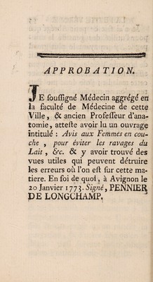 Credit: Avis aux femmes en couche. Pour éviter les ravages du lait, et pour recouvrer une prompte santé. On joint ... une méthode de pratiquer l'inoculation de la petite vérole / [Pierre Fabre]. Source: Wellcome Collection.