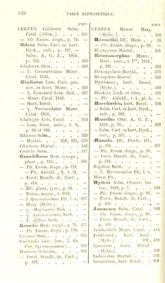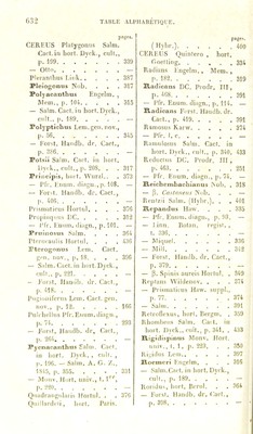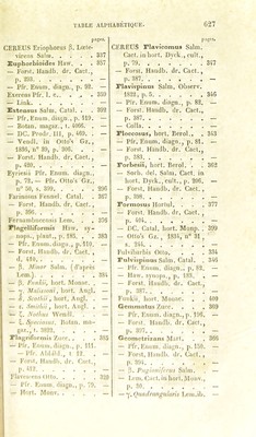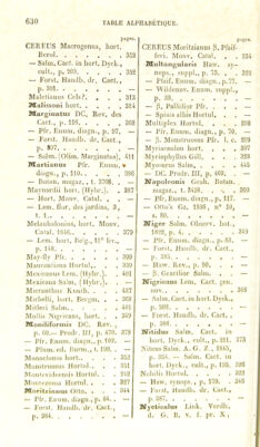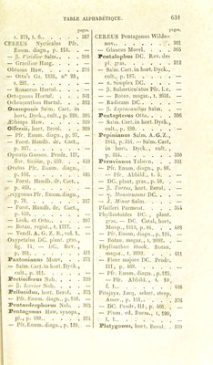 ![pages. CERF.US PlalygoiHis Salm. Cad.in hort. Dyck., cuit., p. 199 339 — OItn — Pleianlluis f.ink 387 Pleiogonus Nob. . , . 317 Polyacanthus Engelm. , Mem., p. 104 315 — Salm. Cad. in hod.Dyck., cnit., p. 189 — Polyptichus Lem. gen. nov., p. 56 345 — Eor.'it. Handb. dr. Cact., p. 386 - Fotski Salm. Cad. in bod. !)V(k., cnil., p. 208. . . 317 Priucipis, lioi t. Wur/.l.. . 373 — Pfr. Enum. diagii., |i. 108. — — Ford. Handb. dr. Cad., p. 406 — Prcsinaticus Hodul. . , . 376 Propimpiii.s DC 312 — l’fr. Eniiin. diagn., p. 101. — Pruino.sus Salm. . . . 364 Pli'i'ocaulis Horlul. . . . 436 Pterogonus Lcm. Cad. gi-n. nov., 1). 18. . . . 396 — Salm. Cact. in liort. Dyck., cnil., |). 221 — — J''()i\st. Ilauùb. dr. Cad., p. 418 - Pngioiiil'crn.s Loin. Cad. gon. nov., p, 12 166 Pul( lidins Pfr.Ennm. diagn., p. 74 293 — E’or.sl. Handb. dr, Cad., p. 264 — Pycnacanthus Salin. Cad. in liorl. J)yck. , cnil. , p. 196. — Salm. A. G. Z., 1845, p. .355 331 — Monv. Hoil. univ., 1.1'^'', [). 220 — Qnadrangiilai is Horlnl. . . 376 Qnillardcii, liorl. l’aris. pages. ( Hybr.) 400 CEREIJS Quinlero , hort. Goelling 334 Radians Engelm., Mem. , p. 182 319 Radicans DC. Prodr. III, p. ^68 391 — Pfr. Enum. diagn., p. 114. — Radicans Forst. Handb. dr. Cad., p. 419 391 Ramosus Karw 374 — Pfr. I. c — Ramniosns Salm. Cad. in liort. Dyck., cnil., p. 340. 433 Redncins DC. Prodr. III, p. 463 251 — Pfr, Enum. diagn., ]>. 74. — Reichembacbianus INob. . 318 — p. Caslaneus Nob. . . — Pienizii Salm. (Hybr.). . . 401 Répandus Haw. . . . 335 — Pfi'. Ennm. diagn., p. 93. — — 1 inn. lîolan. regisi. , t. 336 — — Miquel 336 — Mill 342 — l'orst. Handb. dr. Cad., p. 379 — — p. Spinis aiireis Horlnl. . 349 Rcplans AVildenov. . . . 374 — Prismalirns Haw. snppl., p. 77 374 — Salm 391 Rdroncxns, liorl. lîergm. . 359 Rliomben.s Salm. Cad. in boit. Dyck., cnil., p. 341. . 433 Rigidispinus Monv. Hort. nniv., I. I, p. 223, . . 350 Kigidns Lem 397 Roemeri l'.iigelm. . . 316 — Salm.Cad. in liorl. Dyck., cnil., p, 189 “ Roridns, hort. Ilcrol. . . 364 — Forst. Handb. dr. Cad., p. 398 —](https://iiif.wellcomecollection.org/image/b2812747x_0684.jp2/full/800%2C/0/default.jpg)