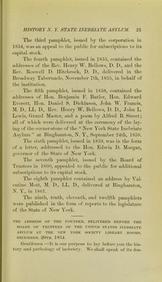 ![Tlie tliinl paiiiplilet, issued l)y the corporation in 1854, was an apj)eal to the public for sul)seriptioiis to its caj)ital stock. • The fourth painplilet, issued in 1855, contained the addresses of the Rev. Ileniy W. Bellows, D. D., and the Rev. Roswell I). Hitchcock, D. D., delivered in the Broadway Tahernacle, November 7th, 1855, in behalf of the institution. The fifth pamphlet, issued in 1858, contained the addresses of lion. Benjamin F. Butler, Hon. Edward Everett, Hon. Daniel S. Dickinson, John W. Francis, M. D., LL. D., Rev. Henry W. Bellows, D. D., John L. Lewis, Grand Master, and a poem by Alfred B. Street; all of which were delivered at the ceremony of the lay- ino; of the corner-stone of the “ New York State Inebriate Asylum” at Binghamton, N. Y., September 24th, 1858. The sixth pamphlet, issued in 1859, was in the form of a letter, addressed to the Hon. Edwin D. Morgan, governor of the State of New York. The seventh pamphlet, issued by the Board of Trustees in 18G0, appealed to the pul)lic for additional subscriptions to its ca^utal .stock. The eighth pamphlet contained an address by Val- entine IMott, M. D., LL. D., delivered at Binghamton, N. Y., in 1801. The ninth, tenth, eleventh, and twelfth pamphlets were jJublished in the form of reports to the legislature of the State of New York. THE ADDRESS OF THE FOUNDER, DELIVERED BEFORE THE BOARD OF TRUSTEES OF THE UNITED STATES INEBRIATE ASYLUM AT THE NEW YORK SOCIETY LIBRARY ROOMS, DECE.MBER, 20TH, 1854. GentEwMi .-—It is our ]»m-])ose to lay DJore you the his- tory and patlioloj^y of inebriety. IVe sliall s]ieak of its des-](https://iiif.wellcomecollection.org/image/b24857014_0025.jp2/full/800%2C/0/default.jpg)