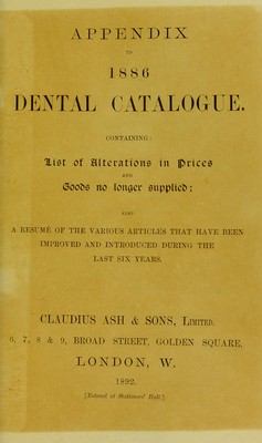 Catalogue of artificial teeth, precious metals, stoppings, dental rubbers, furniture, instruments, laboratory apparatus, tools and sundries manufactured, imported, and sold by Claudius Ash & Sons, 6, 7, 8, & 9, Broad Street, Golden Square, London.