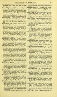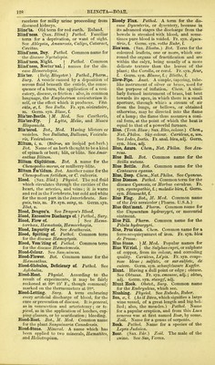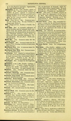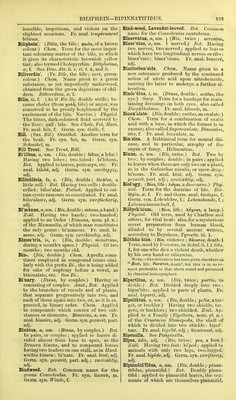 ![irasicible, impetuous, and violent on the slightest occasions. Fr. anal, temperament bilieux. Biliphein'. (Bilis, the bile; tpaihs, of a brown colour.) Chem. Term for the most impor- tant colouring-matter of the bile, to which it gives its characteristic brownish yellow tint; also termed CholepjTrhin. Billphceina, (S, f. See Diss. div. ii. s. vi. t. 4, and 5. Biliverdin'. (Fr. Bile, the bile ; vert, green- colour.) Chem. Name given to a green substance, as yet imperfectly understood, obtained from the green dejections of chil- dren. B'tUvei'dlna, ce, f. Bilis, is, f. (As if Bis lis, double strife; be- cause choler (from x<'^')> bile) or anger, was conceived to be greatly heightened by the excitement of the bile. Nnsvius.) Physiol. The bitter, dark-coloured tluid secreted by the liver; gall: bile. See Chole, Fel, Mars. Fr. anal, bile, f. Germ. syn. Galle, f. BUI. (Sax. Bti.) Ornithol. Another term for the beak. Fr. syn. bee, m. Germ. syn. Schnahel, m. Bill Trout. See Trout, Bill. Bi'lobus, a, um. {Bis, double ; Idbus, a lobe.) Having two lobes; two-lobed: bi'lobous. Bot. Applied to leaves, pericai-ps, etc. Fr. anal, bilohe, adj. Germ. syn. zweilappvj, adj. Bilociilaris, is, e. {Bis, double; locillus, a little cell.) Bot. Having two-cells ; double- celled: biloc'ular. Pathol. Applied to cer- tain cystic tumours so constituted. Fr. anal. biloculaire, adj. Germ. syn. zweifdcherig, adj. Bi'maiias,a,um. (Bis,double: 7nn«Ms,ahand.) Zoiil. Having two hands; two-handed; applied to an Order (Bimana, nom. pi. n.) of the Mammalia, of which man constitutes the only genus : bi'manous. Fr. anal. 6t- mane, adj. Germ. syn. zivcihdndig, adj. Bimes'tris, is, e. {Bis, double; menstruus, during a month's space.) Physiol. Of two months ; two months old. Bin-. {Bis, double.) Chem. A prefix some- times employed in compound terms simi- larly with the prefix jBi-, the n being added for sake of euphony before a vowel, as binoxalate, etc. See Bi-. Bi'nary. {Binus, by couples.) Having or consisting of couples. Anat., Bot. Applied to the branches of vessels and of plants, that separate progressively into two, and each of these again into two, or, as it is ex- pressed, in binary order. Chem. Applied to compounds which consist of two sub- stances or elements. Bindrius, a, um. Fr. anal, binaire, adj. Germ. syn. geziveit, part, adj. Binatus, a, um. {Binus, by couples.) Bot. In pairs, or couples; applied to leaves di- vided almost from base to apex, as the Drosera binata, and to compound leaves having two leaflets on one stalk, as in Hard- wickia binata: bi'nate. Fr. anal, bine, adj. Germ. syn. gezweit, part. adj.; zweizdhlig, adj. Bindweed, Bot. Common name for the genus Convolvulus. Fr. syn. liseron, m. Germ. syn. Winde, f. BLnd-weed, Lavender-leaved. Bot. Commou name for the Co)LV(dmlus cantabrica. Binervatus, a, um. i {Bis, twice ; nervatus, Biner'vius, a, um. ] nerved.) Bot. Having two nerves, two-nerved; applied to leaves which have two longitudinal nerves or ribs: biner'vate: biner'vious. Fr. anal, binerve, adj. Binitroben'zide. Chem. Name given to a new substance in-oduced by the continued action of nitric acid upon nitrobenzide, causing the latter to undergo a further al- teration. Binoc'ulus, i, m. {Binus, double ; ocidus, the eye.) Surg. Tei-m for a bandage for main- taining dressings on both eyes, also called Dinphthalmos. Fr. anal, binocle, m. Binox'alate. (Bis, double; oxdte.s, an oxalate.) Chem. Term for a combination of oxalic acid with a base, in which the former is in excess; oXiiOcaWedSuperoxalate. Blnoxulas, atis, f. Fr. anal, bioxalate, m. Bin'sica. A Rabbinical term for mental dis- ease, and in particular, atrophy of the oi-gan of fancy. Helmontius. Binus, a, um. {Bis, twice.) Bot. Two by two ; by couples ; double; in pairs ; applied to leaves when there are only two on a plant, as in the Galanthus nivalis, or snow-drop : bi'nous. Fr. anal, bini, adj. Germ. syn. geziceit, part, adj.; zweizdhlig, adj. Biol'og^. (Bi'os, life ; Ad7os, a discourse.) Phy- siol. Term for the doctrine of life. Bio- logia, <z, f. Fr. and Germ. anal, biologie, f. Germ. syn. Lebenlehre, f.; Lebenskunde, f.; Lehenswissenschaft, f. Biolych'nium. (Bi'us, life; Xixvos, a lamp.) Physiol. Old term, used by Charlton and others, for vital heat: also, for a mysterious secret preparation from human blood, alluded to by several ancient writers, according to Beguinus, Tyrocin. iii. 1. Biothan'atos. (Bi'a, violence ; edvaros, death.) Temi, used by Forestus, in Schol. ii. I. i. Obs. 1, for one who dies a riolent death, whether by his own hand or otherwise. Ndte.—The derivation has heeii given elsewhere as jSioS, life; flayaTor, death, but this is in no re- spect preferable to tliat above stated and presented by classical lexicographers. Bipartitus, a, um. {Bis, twice; partio, to divide.) Bot. Divided deeply into two : bipartite; applied to parts of plants. Fr. anal, hiparti, adj. Bipeltatus, a, um. {Bis, double; pelta, atar- get, or buckler.) Having two shields, tar- gets, or bucklers ; two-shielded. Zodl. Ap- plied to a Family (Bipeltata, nom. pi. n.) of the Crustacea Stomapoda, the shell of which is divided into two shields : bipel'- tate. Fr. anal, biptlte, adj.; bicuirasse, adj. Bipenella. See Pimpinella. Bipes, edis, adj. {Bis, twice; pes, a foot.) Zool. Having two feet: bi'ped; applied to animals with only two legs, two-legged. Fr. anal, bipede, adj. Germ, syn, zweifussig, adj. BIpinnati'fidus, a, um. {Bis, double ; pinnd- tifldus, pinnatifid.) Bot. Doubly pinna- tifid ; applied to pinnatifid leaves, the seg- ments of which are themselves pinnatifid,](https://iiif.wellcomecollection.org/image/b21462124_0151.jp2/full/800%2C/0/default.jpg)
