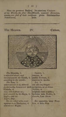 Joh. Amos Comenii Orbis sensualium pictus : hoc est omnium principalium in mundo rerum, et in vita actionum, pictura & nomenclatura = Joh. Amos Comenius's visible world: or, a nomenclature, and pictures of all the chief things that are in the world, and of men's employments therein in above 150 cuts / written by the author in Latin and High Dutch, being one of his last essays, and the most suitable to children's capacities of any he has hitherto made ; Translated into English by Charles Hoole. For the use of young Latin scholars.
