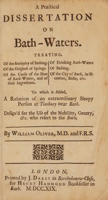 A practical dissertation on Bath-waters. Treating of the antiquity of bathing. Of the original of springs. Of the cause of the heat of Bath-waters, and of their ingredients. Of drinking Bath-waters. Of bathing. Of the city of Bath, its situation, baths, &c. : To which is added, a relation of an extraordinary sleepy person [Samuel Chilton] at Tinsbury near Bath. Design'd for the use of the nobility, gentry, &c. who resort to the bath / by William Oliver.
