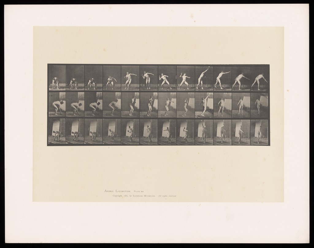 Credit: A naked man bends to pick up a metal ball with his right hand, stands and turns as he throws it. Collotype after Eadweard Muybridge, 1887. Source: Wellcome Collection.