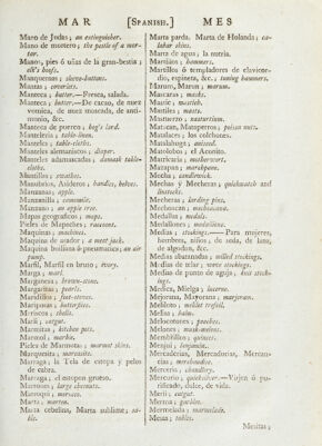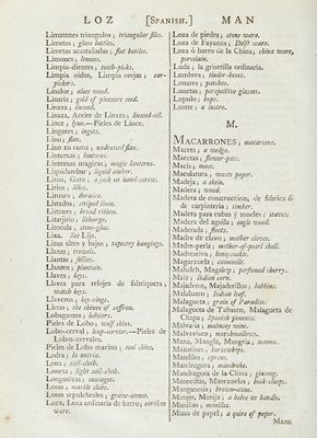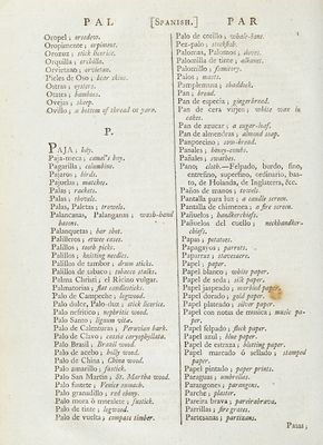 ![Oropel; orsedew* 1 Oropiinente; orpimef^t. j Orozuz ; stick licorice, Orquilla ; crchilla, Orvietano; orvietan. Pieles de Oso ; hear skins. Ostras ; oysters. Otates; bamboos. Ovejas ‘y sheep. O.villo j .a bottom of thread ox yarn. P P A J A ; hay. Paja-meca; cameVshay. Pagarilla ; columbine. Pajaros ; birds. Pajiielas; matches. Palas ; rackets. Palas ; shovels. Palas, Paletas ; trowels. Palancanas, Palanganas ; wash-hand basons. ' Palanquetas; bar shot. Palilleros; etwee cases. Palillos ; tooth picks. Palillos ; knitting needles. Palillos de tambor ; drum sticks. Palillos de tabaco ; tobacco stalks. Palma Christi s el Ricino vulgar. Palmatorias; flat candlesticks. Palo de Campeche 3 logwood. Palo dulce, Palo-duz ; stick licorice. Palo ncfritico ; nephritic wood. Palo Santo ; lignum vitcc. Palo de Calenturas; Peruvian bark. Palo'de Clavo; cassia caryophyllata. Palo Brasil; Brazil wood. Palo de acebo ; holly wood. Palo de China ; China wood. Palo amarillo 5 fustick. Palo San Martin ; St, Martha wood. Palo fustete ; Venice sumach. Palo granadillo ; red ebony. Palo mora 6 moralete ; fustick. Palo de tinte ; logwood. Palo de vuelta > compass timber. Palo de cotillo ; whale-hone- ^ Pez-palo; stockfish. Paiomas, Palomos j doves. Palomilla de tinte s alkanet. Palomillo ; fumitory. Palos 5 masts. Pamplemusa; shaddock. Pans bread. Pan de especia ; gingerbread. Pan de cera virjen; white wax in cakes. Pan de azucar ■; a sugar-loaf. Pan de almendras ; almond soap. Panporcino ; sow-bread. Panales; honey-combs, Pan ales; swathes. Pano; cloth.-—burdo, fino^ entrefino, superfino^ ordinario, bas- to, de Holanda, de Inglaterra, ^c. Pahos de man os ; towels. Pantalla para luz ; a candle screen. Pantalla de chimenea ; a fire screen. Panuelos ^ handkerchiefs. Pahuelos del cuello 5 neckhandker^ chiefs. Papas; potatoes. Papagayos ; parrots. . Paparraz ; st awes acre. Papel; paper. Papel bianco ; white paper. Papel de seda ; silk paper. Papel jaspeado ; sn ar bled paper ^ Pape] dorado ; gold paper. • Papel plateado ; silver paper. Papel con notas de musica; music pa- - per. Papel felpado ; flock paper. Papel azul; blue paper. Papel de estraza blotting paper. Papel marcado 6 sellado j stamped paper. Papel pintado ; paper prints. Paraguas ^ umbrellas. Parangones, parangons. Parche; plaster. Pareira brava; pareirabrava.. Parrillas; fire grates. Partesanas j partizans. Pasas;](https://iiif.wellcomecollection.org/image/b28773329_0372.jp2/full/800%2C/0/default.jpg)