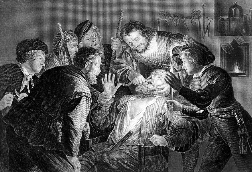 Credit: M0007546: Dentist and assistants removing a patient's tooth. Source: Wellcome Collection.