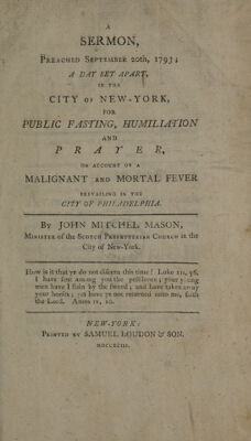 A sermon, preached September 20th, 1793; a day set apart in the city of New York, for public fasting, humiliation and prayer, on account of a malignant and mortal fever prevailing in the city of Philadelphia / By John Mitchel Mason.