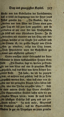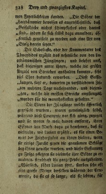 ![nicn ^i^crlid)t(itm fnnljcit. „©le ©t)6ne bee ,)8accbamonier bcwelfen eö «u^enfdjeinücbf bag „0et§el()iebe nid)tö f4)!mpflic()eö obec barteS „tlnb, inbem fie fid) fclbj! baju nnnielben, of» 5,fc»tlid) gcgetgclf j« tpccbeu unb eine 2lrt eow ,>©fo'ä bardii fe^en.“ £)er @d)oIia<?e, ober ber Äommentafor beÄ S.f)ucpbibe^ «rjaf)lf baö nc[)mlid)e eon ben £<t» fcbamontfd)ett Jünglingen; unb belebet baß biejenigen unter t()nen, toefebe bie größte ^njabl t)on (^trelcben gn^bnlttn Jonnten, febt b|el <£bre bnbureb erwarben, „©tefe @ei?e» „luugen, fagt er^, bauerten ju berfd)iebenett 3d* „ten utebrere Sage nadjeinanber, unb biejent* „gen, weSebe bte racijten €trei<^e emplieugcif, „Würben für bie raannbafteflen gehalten.“ £)ie (Edtern ber Jünglinge wcldje ojfentli^ gegeißelt würben, waren gcineitnglid) fclbfl, Wabrenb biefe ^'eremonie bor ^'d) gieng, jugegett unb fic waren fo weit babon entfernt, tbren iScbnen ben ^Xutb baju ju beaebnten, baß ße £>icln]cbr, wie i:iicia!i erjobltr ed für einen Se* weis' ber geigber^igfeit an ibnen bieften , wenn ße einige g-urd)t gegen bie graufamen ©ebfag« bet; ibnen gewähr würben, unb biefer ©eßnnung ju golgc pfH’gten ße uielmebr ihre ©ohne ju er» mabnen, ßgnbbaft bis ganjei^röbe auSjubalteit. j.öBui'fliid), fahrt £ucian fort, ßarbcn febr oft fine große 0?ienge berfelbeu Wabrenb ber '€ere» Ufonie, ba ße tf fo lange, glB ße lebten» f«r](https://iiif.wellcomecollection.org/image/b28763865_0330.jp2/full/800%2C/0/default.jpg)