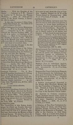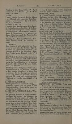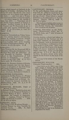 ![CARMINA. SV 4 fe) I CARTWRIGHT. kingdom of Croatia, Declaring how the Sonne did shine like Bloude nine dayes together, and how Armies were seene in the Ayre,... And how also a Woman was deliuered of three prodigious sonnes, ... All which happened the twelfth of lune, last, 1605. . . . Translated out of “the Dutch Coppie, Printed at Vienna in Austria. London. Priuted by R. B. for G Vincent and W. Blackwall, & are to be solde ouer against Guild-hall Gate. “fae 4°, A—B in fours, A 1 and B4 ‘blank. 3B, M, CARMINA. ~Carminym Proverbialivm, Totius huma- nee vitee statum breniter deliniantium, -necnon de moribus doctrinam iucunde _proponentiuim, Loci Commynes. . . . In- tae Londini, 1577. [Col.] Londini, _Exeudebat Christopherus Barkar. 8°. 4 4leaves: A—O4ineights. ZB. I, CAROLINA. -Party-Tyranny Or An Occasional Bill in Miniature : Being An Abridgement of the ‘Shortest Way with the Dissenters. As ‘now Practised in Carolina. Humbly offered to the Consideration of both Houses of Parliament . . . London: Printed in the Year 1705, 4°, A—D, 2 leaves each ; E—F in fours. CARON, R., Professor Jubilate of Divinity. ‘Loyalty Asserted, And the late Remon- strance or Allegiance of the Irish Clergy -and Layty Confirmed and Proved... . London, Printed by T. Mabb, .. . 1662. _ 4°, A—lin fours. Dedicated to Charles 11. CARPENTER, NATHANIEL. Achitophel, Or The Picture of a Wicked Polititian . . . By Nath. Carpenter B.D. _& Fellow of Excet. Coll. in Oxford. Ox- ford, Printed by Leonard Lichfield for ‘Mathew Hunt. 1640. 12°, A,4: B—H in twelves : I, 6. CARPENTER, RICHARD, Pastor of © Sherwill, in Devon. . A Pastoral Charge. Faithfully giuen and discharged, at the Trienniall Visitation of ‘the Lord Bishop of Exon: Holden in Barnstaple the seventh of September. 1616... . London, Printed by Edward Griffin for Francis Constable. ... 1616. 8°, A—K 4 in eights, CARTIGNY, JEAN. The Voyage of the Wandring Knight... London, Printed Ly John Cadwell, for Andrew Crooke,... 1661, 4°, black letter, A—P in fours. ' , To the godly Readers, Grace, and peace from God, &c. [This is a head-line on A, and occupies the whole of that leaf and the top of A 2. Then follows a second head-line :] An Admonition to the Par- liament. [Zurich, 1567-8], small 8°, A—D 4 in eights. This small piece includes other matter at the end—Letters to the Bishops from Beza and Rodolph Gualter, the Admonition itself occupying only 16 leaves, A Second Admonition to the Parlia- ment. [Wandsworth? 1570.} Sm. 8°, A—H in fours, and * with 4 leaves of introduction. Certaine Articles, collected and taken (as it is thought) by the Byshops out of a lytle boke entituled an Admonition to the Parliament / wyth an Answere to the same. Containing a confirmation of the sayde Booke in shorte notes. [Quot. from Esay. 5, 10. and The Prynter to the Reader, 8 lines of verse.] Imprinted we know where /and whan. Judge you the place and voucan. J. T.J.S. Sm, 8°, A—B in fours. In prose, except seven 4-line stanzas 7'o the Prelacie on the back of the title. J. T. may be the initials of Job Throck- morton, CARTWRIGHT, WILLIAM. Comedies, Tragi-comedies . . . 1651, I have before me Dr. Bliss’s copy of this book, bought of Thorpe, with the book- plate of ‘* Thomas Cartwright of Aynho in the County of Northampton Esqr 1698.” It is in the original calf binding, and on the fly-leaf Bliss notes: ‘‘A fair copy in the original state, with the cancelled leaves pp. 801, 2, 3, 4, 5, 6, but those leaves not in their first state, 27.e., with the blanks filled up, of which there is a copy in Christ Church Library. In general the duplicate or can- celled leaves are wanting. A duplicate copy in this copy sign. C 2, the marginal notes having been cut away in the original leaf. Since writing the above I have been able to make this Copy one of the most perfect known, having added the original leaves pp. 301-6 in the first state, & with the blanks filled in the letterpress: together with a variation in one of the leaves con- taining the commendatory verses by Lord Monmouth and T. P. baronet, the initials in the added leaf being replaced with a rose and crown and @ harp and crown.” At the end of the commendatory verses the pub- lisher has this note: ‘‘ We shall not trouble you with an Index, for already the Book is bigger than we meant, although we chose this Volume and Character purposely to bring down its bulk. ... ” Nevertheless, it is said that in a copy in the Bodleian are fragments of an Index,](https://iiif.wellcomecollection.org/image/b33778942_0037.jp2/full/800%2C/0/default.jpg)