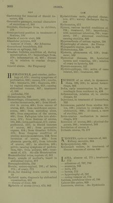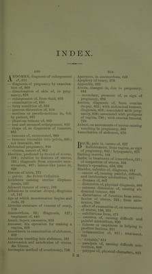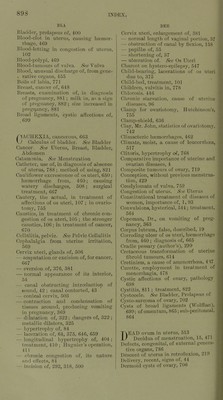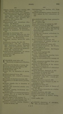 ![GAS Gastrotomy for removal of fibroid tu- mours, 034 Generative .passages, normal characters of secretions of, 505 Genitals, discharges from, in children, 778 Genu-pectoral position in treatment of liexions, 195 Glands of cervix uteri, 506 Glandular pol.ypus, 619 — tumour of ovary. See Adenoma Gonorrhoeal leucorrhoea, 515 Gowers on epilepsy, 545 Graafian follicles, condition of, during menstruation, 17 ; htemorrhage from, 578; inflammation of, 687 ; disease of, in relation to ovarian di-opsy, 700 Gravid, uterus. See Pregnancy HEMATOCELE, peri-uterine, patho- logy of, 570 ; causing symptoms of perforation, 832 ; causes, 576 ; results, 582 ; traumatic, 582 ; diagnosis, 583 ; by vaginal examination, 843 ; causing abdominal tumour, 867; treatment of, 585 — pudendal, 772 Hiematometra, 843 Htemorrhage, climacteric, 462; in peri- uterine hsematocele, 461 ; from blood- clot in uterus, 468 ; from cancer of uterus, 459 ; from cauliflower excres- cence, • 460; from corroding ulcer, 460; from congestion of the uterus, 464 ; from Fallopian tube into abdo- men, 579; from flexions of uterus, 181,463; intra-peritoneal, 571; extra- peritoneal, 573 ; in fibroid tumours of uterus, 461 ; from generative organs, 454 ; from Graafian follicle, 578; from fungous condition of uterine mucous membrane, 112; from inversion of uterus, 462; from placenta prtevia, 457; from tubercle of uterus, 457; in abortion, 455; pelvic, causing symptoms of perfora- tion, 832 ; from polypus, 460 ; treat- ment of, 473. See also Menstruation Hasmorrhoidal veins, rupture of, 581 Heart, sounds of mother's, heard in abdominal region, 877 Hermaphroditism, 792 Hernia, entero-vaginal, 791; of labia, 775 ; of ovary, 775 Hook, for drawing down cervix uteri, 52 Hydatid cysts, diagnosis by abdominal examination, 862 — disease of liver, 862 Hydatids of uterus (true), 472, 862 LAM Hydatid!form mole, physical cliarac- icrs, 471 ; watery discharges due to 508 Hydrometra, 677 Hymen, various morbid conditions of, 794 ; treatment, 797; imperforate] with menstrual retention, 795; treat- ment, 797; abnormal conditions causing sterility, 890 Hypersesthesia of ostium vaginas, 798 Hypertrophy of uterus. See Uterus Hypogastric region, jsain in, 829 Hysterectomy, 635 Hysteria, phenomena of, 528; treat- ment, 563 Hysterical diseases, 59; hysterical nausea and vomiting, 531 ; relation of ovary to hysteria, 693 Hystero-neuroses, 527 Hystero-epilepsy, 544; series of cases related, 551; treatment, 563 INCISION of OS uteri, in dysmenor- rhcea, 500, 318; to arrest hEemor- rhage, 465 India, early menstrviation in, 22 ; me- norrhagia from residence in, 458 Inflammation, relation of, to uterine disease, 63 Injections, in treatment of leucorrhcea, 522 Intercourse, painful from uterine flex- ion, 188 ; relation to ovulation, 19 ; obstructed, 890 ; ill-timed, a cause of sterility, 893 Intra-uterine medication in meuor- rhagia, 479 Inversion of uterus, 385 ; physical dia- gnosis, 386 ; treatment, 388 Involution of uterus, 9 Irritable uterus, 79, 177 KIDNEYS, cysts or tumours of, 863 Kidney, movable, 864 Kolpocystotomy, 823 Kreuznach waters, in treatment of fibrous tumours of uterus, 640 LABIA, abscess of, 771 ; treatment, 772 — adhesions of, 767, 786 — anasarca, 768 — boils, 771 — hernia, 775 — hypertrophy of, 767 — oozing tumour of, 774 Labium, scrofulous ulcer of, 766 Labour-like pains, 829 Lameness, uterine. See Dyskinesia](https://iiif.wellcomecollection.org/image/b21959894_0936.jp2/full/800%2C/0/default.jpg)