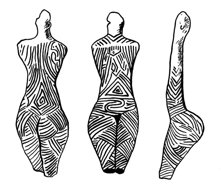 M0015079: Illustration of a Neolithic bodily ornamentation represented on clay figurines, Romania. In copyright. Source: Wellcome Collection.