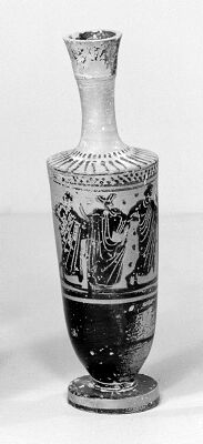 Credit: M0016199: Greek Lekythos-showing satyrs and maenads dancing, leaves in field, on shoulders a cock and two leaves. Source: Wellcome Collection.