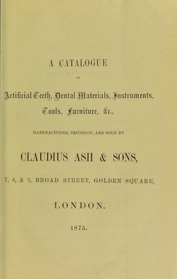 A catalogue of artificial teeth, dental materials, instruments, tools, furniture, &c., manufactured, imported, and sold by Claudius Ash & Sons.