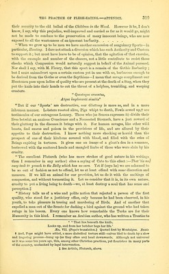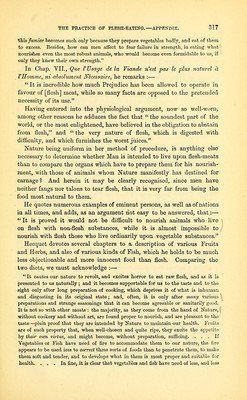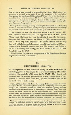 ![show how far a man, supposed to have subsisted in a desert island, without any instruction, or so much as the sight of any other man, may, by the pure light of Nature, attain the knowledge of Philosophy and Virtue. One of the first things he makes him observe is the benevolence of Nature, in the protection and preservation of her creatures.* In imitation of which, the first act of virtue he thinks his self-taught philosopher would, of course, fall into, is to relieve and assist all the animals about them in their wants and distresses Perhaps that voice or cry, so nearly resembling the human, with which Nature has endowed so many different animals, might purposely be given them to move our Pity, and prevent those cruelties we are to apt to inflict upon our Fellow Creatures. Pope quotes, in part, the admirable verses of Ovid, Metam. XV., with Dryden's translation—and an apposite fable of the Persian Pilpai, which illustrates the base ingratitude of men who torture and slaughter their fellow labourers.—I know it (this common ingratitude) said the Cow, by woful experience; for I have served a man this long time with milk, butter, and cheese, and brought him, besides, a Calf every year—but now I am old, he turns me into this pasture with design to sell me to a butcher, who, shortly, will make an end of me.—The Guar- dian, LXI, May 21, 1713. With Pilpai or Bidpai's fable, compare that of La Fontaine on the same subject—L'Homme et la Couleuvre. XI. CHESTERFIELD. 1694—1773. To the expression of the opinion or feeling of Lord Chesterfield on butchering, given, in its place, in the body of this work (page 140), is here subjoined the remainder of his paper in The World. The value of such testimony may be deemed proportionate to the extreme rarity of any protests of this sort from those who, by their influential position, are the most bound to make them :— Although this reflection {the fact of the preying of the stronger upon the weaker throughout Nature] had force enough to dispythagorise me before my companions [in his college at the University of Oxford] had time to make observations upon my behaviour, which could by no means have turned to my advantage in the world, I for a great while retained so tender a regard for all my fellow-creatures, that I have several times brought myself into imminent peril by putting butcher-boys in mind, that their Sheep were going to die, and that they walked full as fast as could reasonably be expected, with- out the cruel blows they were so liberal in bestowing upon them. As I commonly came * So far, at least, as the natural and necessary wants of each species are concerned. —That Nature is regardless of suffering, is but too apparent in all parts of our globe. It is the opprobrium and shame of the human species that, placed at the head of the various races of beings, it has hitherto been the Tyrant, and not the Facificator.](https://iiif.wellcomecollection.org/image/b21084324_0336.jp2/full/800%2C/0/default.jpg)