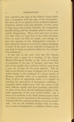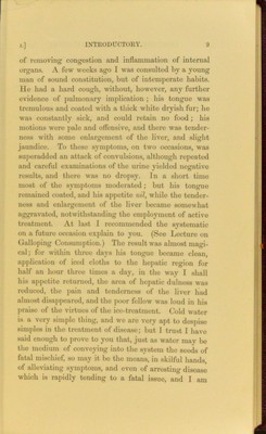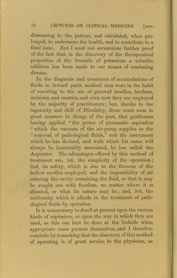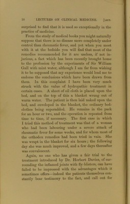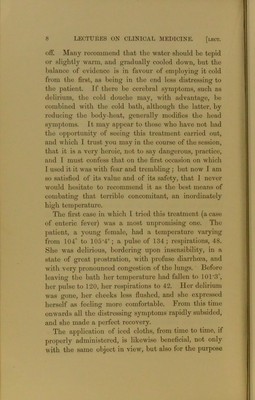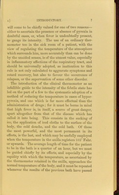![I.] INTRODUCTORY. 7 will come to be chiefly valued for one of two reasons— either to ascertain the presence or absence of pyrexia in doubtful cases, or, when fever is undoubtedly present, to gauge its intensity. The use of an ordinary ther- mometer too in the sick room of a patient, with the view of regulating the temperature of the atmosphere which surrounds him, more accurately than can be done by the unaided senses, is of the utmost value, especially in inflammatory affections of the respiratory tract, and should be universally adopted, as inattention to this rule is not only calculated to aggi'avate symptoms and retard recovery, but also to favour the occurrence of relapses, or the su])ervention of some other di.sorder. The introduction of the clinical thermometer as an infallible guide to the intensity of the febrile state has led on the part of a few to the systematic adoption of a method of reducing the temperature in cases of hyper- pyrexia, and one which is far more effectual than the administration of drugs; for it must be borne in mind that high fever is, in itself, a source of great danger, apart altogether from that of the disease which has called it into being. This consists in the sucking of ice, the application of iced cloths to the surface of the body, the cold douche, and the cold bath. Of these the most powerful, and the most peimanent in its effects, is the last, and which may be usefully employed when the temperature in the axilla registers 105' Fahr. or upwards. The average length of time for the patient to be in the bath is a quarter of an hour, but we must be guided chiefly by its effects, and e.specially by the rapidity with which the temperature, as ascertained by the thermometer retained in the axilla, approaches the normal temperature of the body, and it must be repeated whenever the results of the previous bath have passed rm](https://iiif.wellcomecollection.org/image/b21922974_0027.jp2/full/800%2C/0/default.jpg)