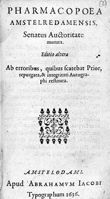 Credit: M0016146: <i>Pharmacopoea Amstelredamensis</i>, 1636: title page. Source: Wellcome Collection.