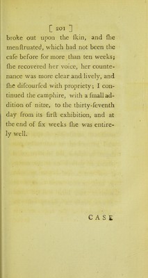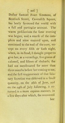 ![[ 20(5 ] Do&or Samuel Foart Simmons, of Bentinck Street, Cavendifh Square, has lately favoured the world with a full and particular account. The warm pediluvium the fame evening was begun, and a courfe of the cam- phire and nitre entered upon, and continued to the end of the cure, ex- cept on every fifth or fixth night, when, in its (lead, I thought proper to give her, as a vermifuge, five grains of calomel, and fifteen of rhubarb; fhe had not menftruated for more than three months before her coming to me, and the firfl reappearance of that falu- tary fecretion was obferved in a fmall quantity, on the 26th of June, and on the 24th of July following, it re- turned in a more copious manner; in a few days after which, fhe recovered her](https://iiif.wellcomecollection.org/image/b21438869_0216.jp2/full/800%2C/0/default.jpg)