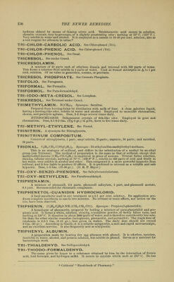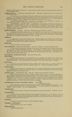 ![VELLOSIN. C23H28N204. Yellow crystals, nearly insoluble in water, easily soluble in hot alcohol, ether, and chloro- form. In physiologic effect it resembles brucin. VERATROL. C0H4<^oqH3. Synonym: Dimethyl Pyrocatechin. A clear, mobile liquid, soluble in alcohol, ether, and fatty oils. Its toxicity is about one- third that of guaiacol, but it is much more caustic. Employed as antiseptic in form of inhala- tions, external application (1 per cent, solution), or hypodermically. In intercostal neuralgia and epididymitis acuta it is stated to have been used with success. VERNON IN. C10H24O7. A glucosid from the root of Vernonia nigritiana, which forms a white, hygroscopic powder, soluble in water, insoluble in ether and chloroform. Said to resemble digitalin and strophanthin in physiologic effect, possessing jz their power. VETERINARY TANNALBIN. See Tannalbin, Veterinary. VICOSIN. A mixture of caramel and extract of saponaria, used for producing a permanent foam on beer. VIERIN. An amorphous, white, bitter principle, of aromatic odor, obtained from the bark of JRemizia vellozii. It melts at 120° 0. (2-18° F.), and is readily soluble in alcohol and chloroform. Employed as a quinin substitute in doses of 0.1-0.2 Gm. (l%-3 gr.). VIROL. A meat extract (liq. carnis comp.). Intended as a substitute for cod-liver oil. VISKOLEIN. A proprietary antiseptic and febrifuge. VITALIN (Gatschkowski). A secret remedy, stated to be boroglycerin. VITOGEN. A surgical dressing, to he used instead of iodoform. Antiseptic, deodorizer, germicide, and non-toxic, inodorous disinfectant. VULNERAL. Contains: Comp. tinct. of benzoin, tinct. of myrrh, of each, 75 parts ; ung. paraf., ung. vasel. co., of each 300 parts ; cerat. cetac, lanolin, of each, 100 parts; boric acid, zinc oxid, of each, 40 parts ; carbolic acid, 12.5 parts; liq. alum, acet., camphor, of each, 7.5 parts; lard, 360 parts. VUTRIN. A concentrated meat extract in powder form, one part of which represents the nutritive value of four parts of beef. WIGGER'S ETHER. See Ethyliden Chlorid. XEROFORM. See under Bismuth Compounds. XEROFORM. (C6H2Br30)2BiOH + Bi203. Synonyms: Tri-brom-phenol Bismuth ; Tri-bromo- carbolate of Bismuth. A yellow, neutral, insoluble powder, non-irritating, inodorous, and tasteless, containing about 50 per cent, of Bi203. Used as an intestinal antiseptic in cholerine, cholera, inflammatory condition of the intestinal mucous membrane; also useful for fresh and infected wounds, old abscesses, buboes, eczema, pruritus, etc.; in gynecology and diseases of eye and ear. Dose, 0.5-1 Gm. (8-15 gr.). (D. E. P. v. Heyden.) XYLENE. See Xylol. XYLENOL SALOL. SeeSalol. XYLENOL-SALOLS. C„H4(OH)COOC6H3(CH3)2. By the action of dehydrating agents upon a mixture of equal molecules of salicylic acid and xylenol (o-, m-, or p-), ortho, meta, or para-xylenol salicylates are formed. These are insoluble in water and soluble in alcohol; employed like salol as intestinal disinfectants. XYLOCHLORAL. Prepared by heating xylose with chlorin in presence of hydrochloric acid. Crystallizes in form of laminte, which are readily soluble in water and melt at 132°. Used as hypnotic in same doses as chloralose. XYLOL. C6H4(CH3)2. Synonym : Dimethylbenzol; Xylene. Obtained from coal-tar by fractional distillation. A clear, colorless liquid of aromatic odor and burning taste, soluble in alcohol and ether, insoluble in water. Used internally as antiseptic for syphilis. Dose, 15-30 drops in gelatin capsules. YOHIMBINE. (C21H28N203)2H20. An alkaloid obtained from the yohimbehe tree. ZAPON LAC. A new quick-drying lac or varnish which consists of gun-cotton dissolved in a mixture of amy] acetate and amylic alcohol. It is coming into use in pharmacy as a varnish for oint- ment boxes, etc., especially the new and elegant celluloid boxes.](https://iiif.wellcomecollection.org/image/b21029568_0144.jp2/full/800%2C/0/default.jpg)