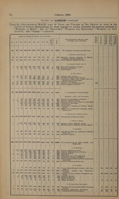 ![TABLE 32.—OccupaTions of MALES acEep 10 YEARS and Upwarps at Ten Groups oF AGEs, in the “WORKING AT Homn” ; also as “ EMPLOYERS,” “WORKING FOR EMPLOYERS,” “ WORKING ON Own Account,” and “OTHERS ”—continued. AGES OF MALES 10 YEARS AND UPWARDS, | soe a s oy ee S 3 a Ag || 2 | wo | wo 3 (pos ; OccUPATIONS OF MALES AGED #6 8 | $8 | 89 | Sg - Fon eS dal! es Sf 10 YEARS AND UPWARDS. So | a | #6 | #4} 28 10-| 14-| 15-|- 20-| 25-|) 35-| 45-| 55-) 6 | as] s ES 8 | St |i Salas ee | |8ey 5 wien ie Ber 255 | 742 | 7063 | 8252{|14071 10195 | 7307 | 4036 1390 | 214 | 53525; IV. Domestic OFFICES OR SERVICES. | | | | | | 1, Domestic Indoor Service, 38 | 162 | 1358 | 1204 | 1601 | 820 | 432 | 178 39 4 5836 | Domestic Indoor Servants in Hotels, ' A ‘ , : eet aan’ | Lodging, and Eating Houses | | 2. Domestic Outdoor Service. 3| 34] 796 | 1548 | 2640 2019 | 1283 | 573 | 139 8 || 9043 | Domestic Coachmen, Grooms... .. «. : : : ; : 1] 10;| 198) 302} 722! 596.) 603 | 309; 134) 24 2799 | Domestic Gardeners... 0. we - ; : . : S 2 5 9 4 | 2 2 | | . 24 | Gamekeepers cia as ic as ote z 5 3 5 F | | 3. Other Service, 5} 20} 327) 318 | 508} 374; 258/ 134] 81) 5 |] 1980 | College, Club—Service ... oh Deas 4 : 5 : : 8 15 | 152) 320} 569 | 398 | 280] 164 52) Ti) 1965 Hospital and Institution Service : J : 5 . 5 39} 117 | 822 | 1265 | 1453 | 1056 | 458 89 5299 | Caretakers ; Office, Park, Lodge, Gate, ete. ath se bs . : ‘ re Keepers (not Government) 5 10 | 330] 696 1331 824 | 479] 212 48 1 3931 | Cooks (not Domestic) _... ae He a 7 n fs ' 12| 25) 337 | 349) 759) 610 | 494 | 396 | 164] 29 3175 | Laundry and Washing Service ... ...| 1309 : ‘ . 77 | 111} 560) 4382] 983) 773) 614] 340] 134 24 4048 | Others engaged in Service a3 oles ' A c | : 237 | 1930 |24023 |25248 |36021 |21805 |14108 | 7932 | 2515 | 442 || 134261 | . V. COMMERCIAL OCCUPATIONS. Merchants, Agents, and Accountants, : 1 16 89; 409 | 506! 464] 333] 136 25 1979 | Merchants (commodity undefined) . 3 ; : x 2 17 | 182] 604 | 2486 | 2585 | 2185 | 1239 | 469 98 9867 | Brokers, Agents, Factors ; é : ; . = ea a tt ie ae A pe ee : 619 | Salesmen, Buyers (not otherwise described)| | : ; : ds . . | 306 | 1666 | 5134 | 3772 | 2575 | 1407 | 458 | 63 || 15881 | Commercial Travellers .. 0... 00 wes A : : ‘ : . : 28 | 166 730] 662 | 505 | 304 | 102] 26 2523 | Accountants ... : ; : . : : A 51 | 149 425 | 471 | 405 | 275 96 20 1892 eeceoneat, ‘Appraisers, ‘Valuers, “Houle : ‘ : bs gents 3/ 25) 33] 93) 114! 116] 75) 29] 10 498 | Officers of Commercial Company, Guild, : Is , : Society, ete. 2. Commercial or Business Clerks. 234 | 1870 |21236 |19090 |21547 |10354 | 5865 | 3086 | 896 | 139 || 84317 | Commercial or Business Clerks 3 2 : . A 3. Dealers in Money. 1 7 | 1055 | 1903 | 2179 | 1247 | 787 | 508| 108] 19 |) 7814 | Bankers; Bank—Officials, Clerks _... ; i : . 1 1 9} 54) 83) 81] 59|] 27 3 318 | Bill Discounters, Brokers, Finance Agents ; ‘ 7 . : 4, Insurance, . 26 | 984] 997 | 1527) 973] 478] 2952) 61] 44 5312 Life, jose. Ship, ete. , Insurance—Officials, ; , ; ; } i erks, ete. . 2} 69) 424 | 1243) 925 | 571 | 361| 121} 25 || 3741 | Insurance Agents ... mati : ‘ ; ; ; ee 2989 [11582 /40712 |34013 [59945 |45513 /29742 |14791 | 4132 | 505 || 243924 | VI. ConvEYANCE OF MEN, Goops, AND MESSAGES. 9 | 149 | 1546 | 1330 | 2072 | 1505. 1099 | 615| 93) 9 || 9497 | Railwa % | ier U y Officials or Clerks... as sek ‘ ‘ F . : : 3) We rie 1468 | 1018 | 586 | 281 | 25 1 5313 | Railway Engine Drivers Stokers cibapae Z . , i 5 a A 2) 866 | 626 | 393] 160 ie J 2332 | Railway Guards _... é a ns A 5 : . 15| 85 | 161 |, 162) 422 | 393 294 | 1382] 17 : 1681 | Signalmen _... : : . 3 . - | 103 a ae 184} 74] 51 7 2 || 1054 | Pointsmen, Level Crossing Men : : ‘ 5 , , : Ww 373 ate 445 | 294 | 184) 31 4 1837 | Platelayers, Gangers, Packers... *, ; : , ; ( 19) 9 399 | 251] 175} 82 9 2005 RailwayLabourers(notRailwayContractors A 3 ; ; . = : é. -, ‘ id abourers) . 23 | 172 | 2415 | 2871 | 3776 | 2583 | 1723 | 875| 198| 16 || 14652 | Railway Porters and Servants Ae ek: ; ; 3 4 e ' 21} 105| 431] 554] 530] 309 97 24 2071 gree th Stable Keepers ; \Coach, Cab—Pro- < 644 353 | 975 99 - ‘3 2 aloeek y prietors 16 | . 85 | 1971 | 3685 | 9022 | 8471 | 5747 | 2895 | 862} 103 || 32857 Coachmen, Grooms (not Domestic);| . 4 ‘ ‘ s te i t : abmen 365 | 2079 |11037 |11123 |16707 |10472 | 5815 | 2337 | 525) 54) 60514 ace, Carriers, Carters, Waggoners (not |. 999 | 57278 | 865 | 1372 I 3 | 59 | 1045 | 3387 | 1957 | 829] .88| 76 6) 7651 | -Ofanibus Bervice ie l0 oS oe 1603 | 969 | 389| 105} 20 A 3737 | Tramway Service 2 : : : . : . : ut 1 1 : 4 68 | Motor Car Drivers Saye at: ete Da 5 ‘ : ‘ . . : 21 44] 34 18 6 151 | ‘Others ont Roads)... skate ahaa oe ; 10 73) 54) 14 3. On Seas, Rivers,and Canals. 7| 28} 780 | 1345 | 2326 | 1634 | 1189 | 660! 172] 920 8161 eben Service; Seamen,Pilots;Boatmen| . 36) 7901} 47] 177 » ve = on Seas 11} 28 ae 7 a a - 977 | 589} 178| 26 || 5641 | Bargemen, Lightermen, Watermen ei : 99) 5255] 227; 60 : : 7 1 97 57 4 383 | Navigation Service (on shore)... Y a ; 187 152 27 va |](https://iiif.wellcomecollection.org/image/b32180433_0102.jp2/full/800%2C/0/default.jpg)