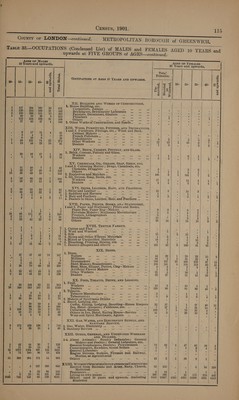 ![i , > AGES OF MALES OccUPIED AND ; } AGES OF FEMALES - 10 Years and upwards. Mates. UNOCCUPIED. FEMALES. | ld Years and upwards, | { 31688 ALL AGES, 50254 | Total i | 2 a tet! Females. 2 | a || . ; q Be] oe 2 -| € 6092 UNDER 10 YEARS. 6401 | f . , ‘ ta ) 10- | 15- |1'25- | 46 | Sh 25596 | 10 YEARS AND UPWARDS. 43853 | Z1B Si i} 1 | % | 45- 35 i Lom _ i : Hy aj s Ps |s°s 2 | S OcCUPATIONS AT AGES 10 YEARS AND UPWARDS. Bliss | 3 ™“ - | 2800} 6134) 10340} 4956) 13866)/25596; ... ToTAL OCCUPIED AND UNOCCUPIED ne 16056)| 3298) 12676) 18366] '7198} 231 2587] - 880) - 328) 481) 600)]} 4821) ... ... Retired or Unoccupied (Order XXIII). ... 9886) 1 3078) 3888] 972¢) 51'70} 2014 263) 5254) 1001'7| 44775] '766|| 20775) ... Engaged in Occupations (Orders I—XXI]). 17911 13068 220) 8788) 8637 ~ 801 I. GENERAL OR LOCAL GOVERNMENT OF THE COUNTRY. 14 127 214 80 4 || 439] 1, National Government... =a ae = ie * 79 3 34 46 Z 3 e 33 234 43 6 316 | 2. Local Government ... tas ae pat Ses ae re 27 4 3 26 2 a II. DEFENCE OF THE COUNTRY. ‘ 20 33 23 15 || | 91 A Army (at Home) ... vor Lace o ‘ « 3 F F “ 1 3 4 5 13 . Navy and. Marines (Ashore and in Por [yee re Ae K 5 - A Ns III. PROFESSIONAL OCCUPATIONS AND TIIEIR SUBORDINATE SERVICES. a 1. Clerical. , 1 44 53 32 || 130 Clergymen, Priests, Ministers . : 3 a ‘ - é 2 21 4h) 4 38 Monks, Nuns, Scripture Readers ; ‘Church Cemetery 105 9 5 66 37-|. <6] —Otticers, etc. : 2. Legal. ® 21 263 | 136 27 447 Barristers, Solicitors ... ee = ton os ‘ 2 : E = we 2 17 77 26 3 225 Law Clerks a gee : i. . i ih at] | 3. Medical. a f ‘ 5 131 53 14 203 Physicians, Surgeons, General Practitioners 4 1 J 5 5 C Pe: : : ‘ ° : - | : Midwives .. Be escrarishes 3 5 3 : 3 4}. 1 ‘ i 5 1 ‘ 6 Sick Nurses, Invalid Attendants ats 371 126 5 73 305 96 23 1 15 -49 12 1 78 Others i a 20 3 ; 2 16 |\% 2 , : 26 125 55 10 216 | 4. Teaching 795 53 2 241 494 |°- 100]. 11 : 26 94 39 7 166 | 5. Literary and Scientific . ... 49 14 ; 8 39 16 ay 1 44 87 65 17 214 6. Engineers and Surveyors : - 3 s 3 2 is 3 111; 318] 161 33 626 | 7 and 8. Art, Music, Drama, ete... 316 77 ‘ 84 228 74 7 IV. DOMESTIC OFFICES OR SERVICES. “1. Domestic Indoor Service. 1 7 | 10 4 ra 22 In Hotels, Lodging, and Eating Houses 79 2 4 34 ohh 16 129 | 90 26 3 || 264 Other Domestic Indoor Servants ... os 12883 696 164 | 6613} 5764 88 FT 1 164 338 | 119 15 || 637 | 2. Domestic Outdoor Service ; A é - ey / } 3. Other Service. : 7 e e | e ° - | . Charwomen ose 47 193 , 28) 104 » I a | 8 | 12 10 an 30 Laundry and Washing Service ace 129 182 1 86 96 sa | ° 19 97 56 14 186 Others ae x 244 123 6 97 154 22, V. COMMERCIAL OCCUPATIONS. i i s 106 750 | 385 73 || 1314 | 1. Merchants, Agents, and Accountants’... a an 12 5 : 1 11 ed 30} 944 / 832] 183 22 || 2011 | 2. Commercial or Business Clerks : =o He ae 474.) °° 13 ~ |, 256 209 |: 2 1| 174; 331] 131 13 || 650 | 3and4. Dealers in Money; Insurance... oa an oe 22 2 - 5 17 of | / eye Ralph tae OF MEN MpgOp ey. AND ie Sa he 51. 150 224 | 116 9 || 504 . On mee haber ts 2 : 2 1 1 i j 2: On Roads. 1} 102 300 | 119 10 |} 532 Coachmen, Grooms (not Domestic)! ; Cabmen “% 5 3 FS 5 d 7) 146] 210 46 2}) 411 Carmen, Carriers, Carters, W. peequers ee Fy) 1 : ; é ik - Sa 62} 267 7 8 |} 411 Others : nes ‘ 1 y - : a 3 9 | 26 10 2 || 47 On Seas, Rivers, and Canals Sea sae a , ‘ < A 4 A . | 2 | 4 4 ai 10 re In Docks, Harbours, etc... et ee : ; 5 s io | . j 5. In Storage, Porterage, and Messages, | 113} 1% | 69 42 8 || 426 Messengers, Porters, Watchmen (not Railway r ‘. 1 - “ p / | or Geverneant we sf 36 SET IGH ) As eotay Others ET a. WAM ae ee eee pees sien 33 1 y 17 15 is 5 | VII. AGRICULTURE. i : 1. On Farms, Woods, and Gardens. : y Zz} bE 1S ao 31 | 325 Gardener {not Domestic); Nurserymen, Saaduniant 23 8 |i i 16 12 . | orists if 4 | 5 | 9 7 2 | 23 | Others Ss Cheeses ieee he eas 2 dee 3 3 F J 2 | VIII. Fisuinc. é } d a Ps e | : 1. In Fishing ove ave ce nate _— nae oes - | a = . . . | ; | i | IX. IN AND ABOUT, AND DEALING IN THE : PRopuctrs OF, MINES AND QUARRIES. h : i Land 2. Mines and Quarries. ' + | 2 | 8 6 -‘tHaes 16 Workers a S05 ics <il . . . : ; - | 4); 19 15 | 4 42 | eaters’ Vs.9 os. ie : : F . , | | : X. METALS, MACHINES, IMPLEMENTS, & CONVEYANCES. | a | 1] 3 ‘ - | 1| 1and 2. Iron, Steel, ete., Manufacture pay ; ‘ 5 4 p ¢ | . L i] 3. Engineering, and Machine Making), ‘ F317 28 35 | 18 1 | 74 Blacksmiths, Strikers .. % d En aioe : 1 ° - . 1 a 20 | 22 13 | 2 || 57 Erectors, Fitters, Turners F ; ed . >| . « . « - 5 ] 65 | 94 34 7 jj 200 pasere Be 3 i eae 2 - 6 1 4 1 q . | 2 3 = . 8 4, Too . oo . a = . . . . . m of : | 3 3 2 | 2] 10 5. Types, Dies, Medals, Coins. ... - - ss + . Z = a * ae ol 1 / 5 3 1 1] 10 6. Ar ave aoe oer oo - ary | . . . . . . Sih, eas) | 26 9 SH] 68H h 27. Tineekieipcttes Metal Trades ee: ---4 ad head ad Hes ee onl : E 4 i A 2 el i | 2 1 1} 4 8. Ships and Boats ie as . at pe : 5 « a e ° - iin 38), Ghia 32 Sill ey 143 ‘las. Vehiclosicstartu death sndelekt a ee oat re ie : : : E 4 4 | ae 1} 2%] 71] 31) 71} 136] 10. Dealers FIle fostid atl eet Pac be. 4 oped 3 1 : 1 2 Leis } H ad - i}. XI. Precious Merats, JEWELS, WATCHES, INSTRU- | } } MENTS, AND GAMES. . vj ee | 1-5. Prec*. Metals, Jewely.; Watches, Instrmts.; a sii 2} 2) 7] 31) 8) 144 Goldsmiths, Silversmiths, Jewellers .. ra 4 1 . : 5 yj. 14 23; 13) 4] 6 Watchmakers, Cleckmakers . s : Sy ah : 2), 9% | lll WZ} = 2 He, 225 Electrical Apparatus Makers ee re rhe yh : : a a S al 3 REAP St. Si) 150 Musical Instrument Makers = bona Re os 5 1 : 5 : 1| a3| 27] 19) 2'iw snl Wther Workors wm a 131 eee 6 3 i} 4 33 he 21 | 5 {ll aabBS eee Wealere ss 5 3 ar a a Bae sailed tre + 2 ~ 3 1 : : ; , a0](https://iiif.wellcomecollection.org/image/b32180433_0144.jp2/full/800%2C/0/default.jpg)