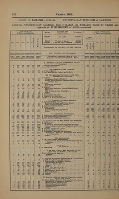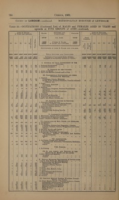 ![AGES OF MALES ey OCCUPIED AND AGES OF FEMALES 10 Years and upwards. ) MALES, UNOCCUPIED. | FEMALES. 10 Years and upwards. - iF 61626 ALL AGES. 82350 Total 4 3 gf x Females, Ys 3 || ‘3 S * é : 11965 UNDER 10 YEARS. 12131 2 = 10- | 15- | 25- | 45- 3 a 49661 | 10 YEARS AND UPWARDS. | 70219 wg [rg S|] BO | BO feos hao 8 e o ® si| 3 ae (Bee zg =| bas PE |gos S OCCUPATIONS AT AGES 10 YEARS AND UPWARDS, a |S 5 | | 5239 12529 19674 (9882 |2337 49661] ... .. TOTAL OCCUPIED AND UNOCCUPIED. . 38766 31458 5646) 1'7'753| 28749 13679|4892 4589 1057 | 583. 821 | 985 |} 8035 | ... ... Retired or Unoccupied (Order XXIII.) ... ae L3'753 26263 5257| 5422) 16239 94203678 650 |114'72 19091 |9061 |1352 |41626 Engaged in Occupations (Orders I-X XII.) . 25018 | 5190 || 389 | 12331) 12510) 4259) 714 | | I. GENERAL OR Loc4aL GOVERNMENT OF THE : . COUNTRY. 53 345 475 | 128 16 TOE He National Government Fas ie ae a Te 74 9 ; 30 46 6 1 1 71 303 75 14 464 | 2. Local'Governmentiens 12 cscielie-ctlaas [leh oacesiee teense ses 55 7 ; 15 37 9 1 . II. DEFENCE OF THE COUNTER cs At 57 101 129 69 Boon os. Army (at Home) is ses ‘ . i é é - . “ 4 il 18 12 45 | 2, Navy and Marines (Ashore and in Port) . = pean ‘ : A . , ‘ A III. PROFESSIONAL OCCUPATIONS AND THEIR # SUBORDINATE SERVICES. o s 1, Clerica 2 73| 68) 45 || 188 Clergymen, Priests, Ministers ; 3 i ; : . 4 6 22); 23} 10 61 Monks, Nuns, Scripture Readers ; Church, Cemetery 99 18 : 4 59 48 6 A yee etc. . Lega : 15 | 282} 208 | 49 504 B isters, Soli citars epee Gbcite Goceee ‘ F . , 3 : - 9| -231| 138] 29] 21) 409 Caw lpreea pit Khe arr 4 ; : 3 1 : : 3. Medical, : 11} 129} 80} 34 254 Physicians, Surgeons, General Practitioners 2 2 : 3 4 ‘ - . : : : . . Midwives ... Es +e 6 7 ’ 1 8 3 1 ‘ 1 at : . 10 Sick Nurses, Invalid Attendants = 459 | 247 . 50} 402) 197] 57 1 27 70 28 5 131 Others eis aA 33 11 ; if 27 10 4 46 158 54 10 268 | 4. Teaching 766 67 4) 262) 447 110} 10 ‘ 26 82 | 46 6 160 | 5. Literary and Scientific 42 15 4 6 31 18 2 23 96 51 12 182 | 6. Engineers and Surveyors 4 E A ; ‘ , . 4 a 148 360 | 168 21 697 | 7and38. Art, Music, Drama, ete... 369 99 2 146 246 62 12 IV. DomMESTIC OFFICES OR SERVICES. e 1. Domestic Indoor Service. 1 67 38 | 14 i 141 In Hotels, Lodging, and Eating Houses 286 22 7 | 982) tor 17 1 28 | 461; 483) 187 18 |) 1177 Other Domestic Indoor Servants . 14536 | 1168 || 205] 6862] 6911 | 1533 | 193 By aol HS add gh) 1929 871 | 2. Domestic Outdoor Service a A ; . ’ ; : 3. Other Service. . . us ‘ . . Charwomen. 99 535 1 30 255 296 52 1 29 59) 44 9 142 Laundry and Washing Service 547 | 727 11s) . 4d) 4550) 95339 || iso 3 66 189 | 130 29 417 Others 201 284 iL 89 192 171 32 V. COMMERCIAL OCCUPATIONS. PS 123 | 642 | 326) 72 || 1164) 1, Merchants, Agents, and Accountants 23 8 ’ 6 22 4 ; 52} 1342 967 | 199 24 || 2584 | 2. Commercial or Business Clerks 779 25 1 501 277 11 4 1} lov} 275) 110} 20 563 | 3and4. Dealers in Money ; Insurance... 13 1 : 4 8 2 : yi e x oe Eile Sg OF ha i: GOODE A AND AREGAGES: 24 Sil 1150 522 27 2534 . On Railw ays. ose is S 1 2 3 2 . = 3 : . On Roads. , dol | 1112 | 664 | 80 || 2214 Coachmen, Grooms (not Domestic) ; Cabmen A F : ; ‘ : 42) 634) 851 | 293 16 || 1836 Carmen, Carriers, Carters, Waggoners (not F arm)... 2 5 : ; r : 54 268 | 134 20 476 Others oo a 3 3 ‘ 1 5 é 2 42 69) 37 11 161 . On Seas, Rivers, and Canals 8 1 rf 2 é F 4 30 ik : 48 t mn pots Harbours, ete... aay 2 : ‘ 5 . ae n Storage, Porterage, an essages. 246) 755 | 329| 146] 12]| 1488 Messengers, Porters, Watchmen (not Railway 15 7 8 > ‘ 4 or DY Crna) 2 88 145 52 1 288 Others re rs te SS ee Pl: @ mit 53 1 39 14 1 F VII. AGRICULTURE. % Z 1, On Farms, Woods, and Gardens. : 25 70} 85] 23]/ 203 Gardeners (not Domestic); Nurserymen, Seedsmen, 64 8 42 26 4 4 Florists 4 9 7 2 22 Others See Be Est ok, eae Se. 1 2 - 1 . 7 VIII. FISHING. x e ‘e ¥ ° ° Ln: Fishing ave eee eee ave eve oo see ov ‘ e . e ry ° ° IX. In AND ABOUT, AND DEALING IN THE PRODUCTS OF, MINES AND QUARRIES. 4 6 land 2. Mines and Quarries. 5 1 17 2 39 Workers _... Ss ats we * ve “3 “3 . : . . : : . : 2 18 | 13 ’ 33 Dealers 3 . 2 . . 1 1 . 1 1 1 3 X. Mrraus, MACHINES, IMPLEMENTS, & a ee: : : ae 2. Iron, pee es fine Making ° € ° ° e e . a ’ ngineering, an achine Makin 3 el ae ed | ra Blackenitea. Strikers .. of = oa ae : . : : 2 W1 me is 1 Erectors, BUEUErG Turners a3 . ‘ D : : : . L 167 70 5 355 Others 2 A : 1 1 ‘ “ ‘ 2 : : 20') «4. PToolsae—. ac = a . ‘ . . . : : 3 21 4 ' : 6 5. Pel onny Dies, Medals, Coins ‘ : , : . . . 2 64 Pe a 7. 40 G.PATINS. Nee . . ‘ » |e ; % ‘ ; 5 i 3 of i. Miscellaneous Metal Tr Trades . sti 9 . 1 8 . : 2] 153} 280) 160] 231) @27| 9 vohinie pathens i 3 } : 3 i 1 41 83} 29) 10 164 | 40, Dealers Molte haueeit 209: f 9 : , 7 2 . XI. PRECIOUS METALS, JEWELS, WATCHES, INSTRU- 1-5. Prec:. Metal edioueis LE ey Instrmts Gi y 3 rec’. Metals, Jewely atches, Instrmts.; Games. d a A a 5 Ae Goldsmiths, Silversmiths, Jewellers. ... oe 9 1 2 5 5 5 r 4 138 163.| 21 306 Watchmakers, Clockmakers St abe seb) bn os : i . : e 1 . 3 Bl 50 | 27 rn 135 Electrical Apparatus Makers ee tr Ee . 1 : D 1 3 3 . 3 29 43| 15 3 a3 rte poe eer Makers ves fe RUT 4 i : é = 4 ° er Workers ... aes eee ae eee =e as . : - a 3 68 ealers “ae des) ete” [pecs EAPEAE HOO, a 12 2 ’ 3 6 5 “ a ee ee ee ee](https://iiif.wellcomecollection.org/image/b32180433_0156.jp2/full/800%2C/0/default.jpg)
