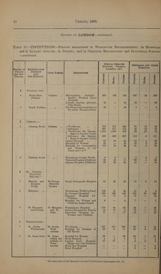![—continued, Number of] REGISTRATION District DISTRICT and Sub- AND | Sus-DistTRict. ! District. | 2 FULHAM—cont. North-East Fulham 5 South Fulham 3 CHELSEA :— I Chelsea, North 2 Chelsea, South 4 ST. GEORGE, HANOVER SQUARE :— 1 Mayfair and Knights- bridge 2 Belgrave 3 St. Margaret and St.John 5 _ | WESTMINSTER :— 1 St. James, Westminster 2 St. Anne, Soho SPECIAL INMATES (Patients, Paupers, Lunaties, ete.) FAMILIES. CIVIL PARISH. INSTITUTION. ; ; wh c wa . Zz 38 Eitoddy st & B 8 3 B 8 3 oo - g 6 o> g a ® = ® Aa. = 4 Ay = co Fulham Metropolitan Asylums 308 139 164 - 247 24 223 Board’s Western Fever Hospital Lunatic Asylum (private), 22 — 22 23 — 23 Otto House | * Elm House Industrial School 39 — 39 5 _ 5 for Girls, Parson’s Green | Chelsea Workhouse 702 274 428 31 12 19 eee ee =n Ao 391 217 174 85 13 72 ‘ Workhouse (St. George, §| 1,584 1,029 555 39 21 18 Hanover Square Union) Infirmary (St. George, 630 323 307 114 3 111 Hanover Square Union) Cancer Hospital ae 87 23 64 54 4 50 Hospital for Women : 52 — 52 20 2 18 Hospital for Consumption 112 76 36 81 5 76 and Diseases of the! Chest (part of )* 33 Workhouse Casual Wards 8 8 — 5 3 2 Vietoria Hospital (Children) 36 19 17 39 5 34 Cheyne Hospital (Children) 50 26 24 16 — 16 St.George, Royal Orthopeedie Hospital 45, 22 23 15 3 12 Hanover Square a Workhouse (Wallis’s\ Yard) 109 51 58 12 4 8 St. George’s Hospital : 283 163 120 153 25 128 Belgrave Hospital for 14 ll 3 12 — 12 Children ; Hospital for Women and 6 — 6 7 — 7 Children, Lupus Street St. Margaret | Westminster Hospital .. 178 84. 94 63 7h: 56 and St. Gordon Hospital for Fistula 16 10 6 12 — 12 John Grosvenor Hospital for iy —- 17 13 — 13 Women and Children St. James, Workhouse ... ve on 425 172 253 20 5 15 West- Hospital for Diseases of 22 1 11 21 2 19 minster the Throat ; St. Anne Hospital for Women 39 — 39 28 1 27 within the | Home Hospital : oe 4 3 1 4 — 4 Liberty of | London Lock Hospital 27 a — 6 3 3 West- (Males and Out-Patients) minster Royal Ear Hospital vs — — 2 — 2 Heart Hospital a — — 6 — 6 : |](https://iiif.wellcomecollection.org/image/b32180433_0072.jp2/full/800%2C/0/default.jpg)