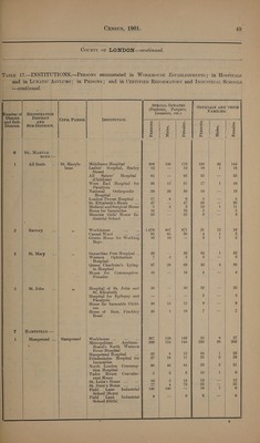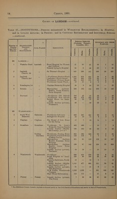 ![County 0F LONDON—continued. SPECIAL INMATES I * (Patients, Paupers, OFF Me ae Te Number of| REGISTRATION | Lunatics, ete.) District DISTRICT : 5 Bei, Aub CIVIL PARISH. INSTITUTION. 3 : a r District. | SuB-DisTRIcT. 3 g 3 9 g 4 ef iC 5 a c 6 mo | & cs a | & oo 24 LAMBETH :— 1 Waterloo Road} Lambeth ... | Royal Hospital for Women | 47 10 37 16 1 15 and Children General Lying-in Hospital 35 6 29 29 1 28 2 Lambeth 4 St. Thomas’s Hospital 425 238 187 249 28 221 Church, Ist 3 Lambeth ‘ Haba (Renfrew Road) 1,282 618 664 29 6 23 Church, 2nd Infirmary (Brook Street)... | 584 305 279 94 8 86 Workhouse (Princes Road) | 381 210 171 10 6 4 Workhouse Casual Ward... | 13 11 2 4 2 2 4 Kennington, Ist i Clapham Maternity Hospital 28 8 20 23 a 23 6 Brixton aA ‘9 Metropolitan Asylums 206 102 104 209 23 186 Board's South-Western Fever Hospital “| Norwood ue: i ( Workhouse Old Schools 100 43 57 oo — 33 ( Workhouse New Schools 498 276 pie 22 2 20 British Home for Incur- 80 23 57 32 5 27 ables Lunatic Asylum (private), 28 = 28 23 3 20 Fenstanton 25 WANDSWORTH :— 3 South-West Battersea ... | Workhouse Infirmary 668 327 34] 92 8 84 Battersea Bolingbroke Hospital 24 13) 11 9 3 6 4 Clapham _.... | Clapham ... | The Hostel of God, Home 17 7 10 14 1 13 for the Dying 5 Streatham ... | Streatham... | Workhouse, St. Anne's 469 469 = 10 7 3 Home (St. Pancras Parish) Lunatic Asylum (Middle- 190 102 88 32 9 23 sex County), part of * Tooting Workhouse, Tooting Home 605 282. |: 323 35 2 33 Graveney | Workhouse, Fairfield House 123 116 7 7 4 3 (Chelsea Parish) Metropolitan Asylums 201 91 110 153 16 137 Board’s Fountain Fever Hospital Metropolitan Asylums 189 87 102 228 25 203 Board’s Grove Fever Hospital Lunatic Asylum (private), 19 19 — 15 10 5 Newlands 6 Wandsworth Wandsworth | Workhouse ... Er sek 686 410 | 276 23 9 14 — Royal Hospital for Incur- 220 36 184 98 16 82 ables Home for Inebriates, North- 13 — 13 5 a 5 lands Lunatic Asylum (Middle- | 1,141 477 664 121 30 91 | sex County), part of * Lunatic Asylum (private), 11 _— 1l 9 _ 9 The Huguenots H.M. Prison, Wandsworth || 1,059 1,059 — 291 166 125 Common Boys’ Home Reformatory... 115 115 — ag 8 a 7 Putney | Putney ... | Lunatic Asylum (private), 7 39 38 97 30 67 The Priory * The Middlesex County Lunatic Asylum is situated partly in the Civil Parish of Streatham and partly in that of Wandsworth.](https://iiif.wellcomecollection.org/image/b32180433_0078.jp2/full/800%2C/0/default.jpg)