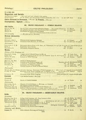 ![K §§ 280-281 Mag-azines and Serials. Archivio Glottologico —has contd. and conts. valuable Celtic articles. Revue Celtique ed. H. Gaidoz, and subsequently d'Arbois Jubainville, vols, i.-vi. Celtic Element in Romance, v- k § 256; in French, v. k § 270. Inscriptions: Ogham—z-. g § 14. ea. 20/- m 8° Paris 70 sqq. Old Gallic. Gluck, Chr. W. MONE, F. MONIN, H. C/iresfomat/iy Breton (Armoric), Grammar. HiNGANT, Abbe J. Legonidec, J. F. M. Dictionaries. Legonidec, J. F. M. Loth, J. Troude, a. E. Welsh. History of ihe La7tguage, etc. Bradshaw, Henry James, Ivor *Rhys, Prf. John Grammar. Nettlau, Dr. Max Rowland, 'I'h. Saitler, E. Spurrell, W. 280. CELTIC PHILOLOGY (/'): CYMRIC BRANCH. Die bei Casar vorkommenden keltischen Namen [by a pupil ofZeuss] 3/- Die gallische Sprache u. ihre Brauchharkeit fur d. Gescliichte o.p. Monuments des anciens Idiomes Gaulois Endeavours to establish the influence of Celtic ou Gallic Latin. — K § 282 (subvoc. Holder). Munich Carlsruhc Paris 57 57 72 Elements de la Grammaire Bretonne Graramaire Celto-Bretonne, ed. Brizeaux 3/- 8° Treguier 69 21/- 8° Paris [sec. ed. 36] 50 Dictionnaire Breton-Fran9. et Fr.-Bret., ed. Villemarque, 2 v. o.p. [pb. w. 42/-] 4° Saiiit Brieuc ; 50 Vocabulaire Vieux Breton 8/6 8° Paris Dictionnaire Frangais et Breton 10/- 8° Brest 43 —papers i» his Collected Papers [ut K § 3] The Welsh Language in the xvi. and xvii. Centuries [repr. Lectures on Welsh Philology Studies in Welsh Grammar Grammar of the Welsh Language, 4/6 y Goineryd: Grammatik d. Kymraeg Grammar of the Welbh Language Practical Lessons in Welsh on Natural Method 16/- fr. Red Dragoni 2/- 15 - c : Exercises 4/6 p 8'^ 10/- 8° 3/- f 8° 2/6 12' Camb. Press 89 Owen, Cardiff 87 Trubner [77] 81 in prep. Bala\bT\ 76; [71]78 ZJinch 86 Caefyrddin [48] 70 Carmarthen 81 Dictionaries. 'Evans, Rev. D. Silvans Geiriadur Cymraeg: Dictionary of Welsh Language, pt. i. ' Dictionai-y of the W'elsh Language expl. in English, 2 vols. Pughe, W. Owen Spurrell, W. Cornish Grammar, NORRIS, E. Dictionaries. Bannister, Dr. J. Jago, F. W. B. POLWHELE, Rev. R. *Williams, Rev. R. 10/6; ii. 5/-r 8° Spurrell, Car;«(7r//i^«8 7 ;88 o.p. \_-cu. 60/-] r 8° Denbigh [03] 32 The first edn. was pub. under name of Win. OWEN, after which the author changed his name. Dictionary of the Welsh Language —for Modem Dialect, v. K § 241. Sketch of Cornish Grammar [both parts] 8/6 f 8° Caerfyrddinid,%-i,c)\Z^ 3/- 12° Parker Glossary of Cornish Names—v. K § 241, s.v. Cornwall. An English-Cornish Dictionary 21/- 4° Simpkin Cornish-English Vocab. and Provincial Glossary, pi. o.p. \iu. 25/-] 4° Trura Lexicon Cornu-Britannicum, w. examp. and tr., 3 pts. in I vol. 42/- 4° Llandovery Conts. Welsh, Armoric, Irish, Gaelic and Manx synonyms, w. illus. fr. Sanscrit, Gk., Lat., German, etc. 59 87 [08] 36 62-65 Irish. Gramjnar. BoURKE, Can. U. J. Joyce, Dr P. W. O'Donovan, Dr. J. *WlNDISCH, Prf E. Wright, C. H. H. Phonology and Metrics. 281. CELTIC PHILOLOGY Kc) -. IRISH-GAELIC BRANCH. College Irish Grammar, 2/6 ; Easy Lessons in Irish 2/6 Grammar of the Irish Language i/- Grammar of the Irish Language [scholarly] o.p. [pb. 21/- ; w. 10/6] Grammar of the Irish Language, tr. Dr. N. Moore 7/6 Compendium of Irish Grammar, tr. McSwiney 6/- Grammatik der Altirischen [Indogerm. Grammatiken] Grammar of the Modern Irish Language 2/6 s 8° s8° 8° c8° Dublin 79 ; Gill, Dublin Dublin Camb. Press Gill, Dublin Leipzig Williams ZiMUER, H. Ueber altirische Betonung und Verskunst 1002 6/- 8° Berlin [67] 77 79 45 82 83 tn prep. [55] 60 84](https://iiif.wellcomecollection.org/image/b21693985_1128.jp2/full/800%2C/0/default.jpg)
