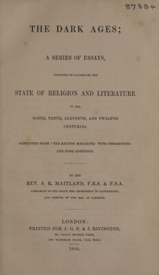 The dark ages; a series of essays, intended to illustrate the state of religion and literature in the ninth, tenth, eleventh, and twelfth centuries ... / By the Rev. S.R. Maitland.
