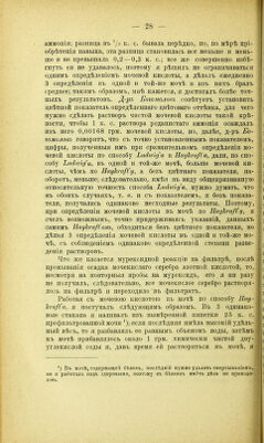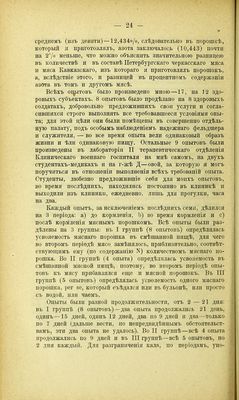 ![постановкѣ опытовъ, я долженъ упомянуть, что настоящая ра- бота начата въ обстановкѣ ыаленькаго провинціальнаго госпи- таля на Кавказѣ (въ г. Темиръ-Ханъ-Шурѣ); чтобы имѣть подъ рукою возможно свѣжій мясной порошокъ, я приготов- лялъ его самъ, по способу ВеЬоѵе, съ тою лишь разницею, что сырое мясо я высушивалъ при температурѣ не выше 70 градусовъ, часто ниже (ВеЬоѵе высушивалъ при 90°), такъ какъ и при такой температурѣ, по истеченіи 6—8 часовъ, мясо преврап],алось въ совершенно сухую корку, свѣ-Аіо-коричневаго цвѣта, по истолченіи которой и просѣиваніи чрезъ густое сито, получался нѣжный порошокъ, свѣтло-коричневаго цвѣта, съ запа- хомъ жаренаго мяса и слегка солоноватаго, не непріятнаго мяснаго вкуса; къ порошку прибавлялось около 7»°/*^ обыкновенной пова- ренной соли; затѣмъ онъ сохранялся въ сухомъ мѣстѣ и расхо- довался по мѣрѣ надобности. Заразъ, я приготовлялъ его не болѣе 1 — 2 фунтовъ. Для приготовленія одного фунта порошка, въ среднемъ, нужно было употребить не менѣе 6 — 7 фун- товъ свѣжаго мяса, освобожденнаго отъ жира, костей, сухожи- лій и видимой соединительной ткани. Здѣсь же, въ Петер- бургѣ, для дальнѣйшихъ опытовъ, я пользовался мяснымъ по- рошкомъ, приготовлявшимся въ Спб. Гигіенической Лаборато- ріи питательныхъ веш,ествъ д-ра Карѣева, гдѣ свѣжее мясо высушивалось при температурѣ не свыше 50°. По анализамъ проф. А. Л. Діатта, произведеннымъ въ химической лабо- раторіи Военно-Медицинской Академіи, мясные порошки изъ СПБ. Гигіенической лабораторіи питательныхъ веществъ имѣютъ слѣдующій составъ Воды 4,7327о Золы . 4,452 Жира 9,730 Бѣлка 5 7,29 ) Клеевыхъ и экстрактивныхъ ве- І 81,08°/о ществъ 23,79 ) Всего . . . 99,9957о Среднее содержаніе азота въ моемъ порошкѣ (изъ 9 анали- зовъ сыраго вещ. порошка), было—10,443°/о, въ порошкѣ изъ СПБ. Гйгіенич. лабор. питат. вещ., по Діанину, (раздѣляя 81,087о бѣлковъ на бѣлковый коэффиціентъ—6,3) 12,8687 азота по Еурлову — 12,7137о, по моимъ опредѣленіямъ, въ ') Назаровъ. Диссертація I. с.](https://iiif.wellcomecollection.org/image/b22312870_0027.jp2/full/800%2C/0/default.jpg)